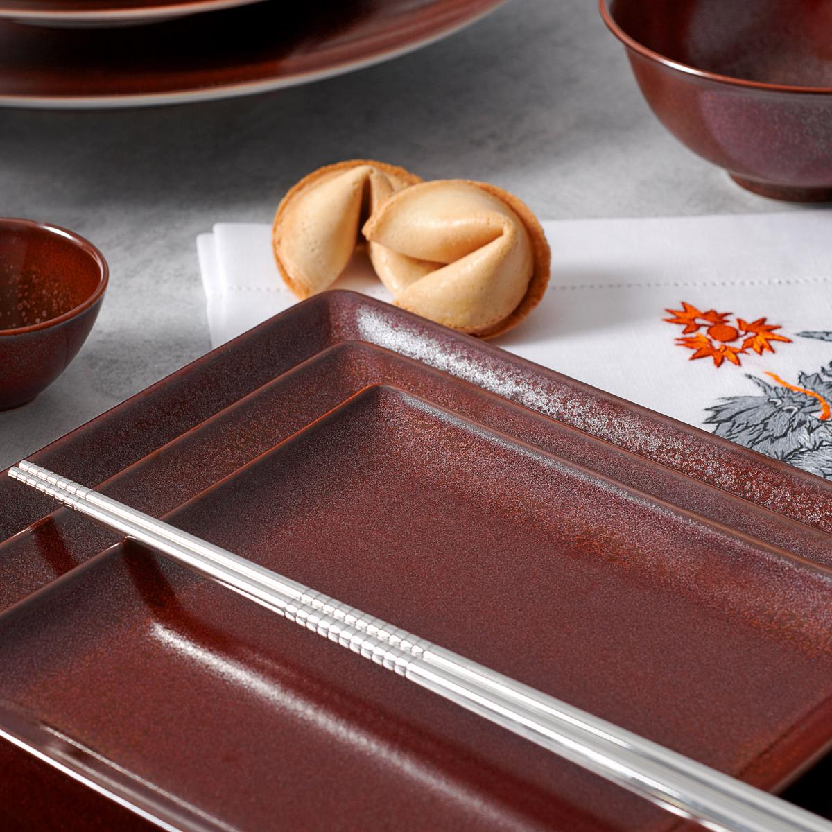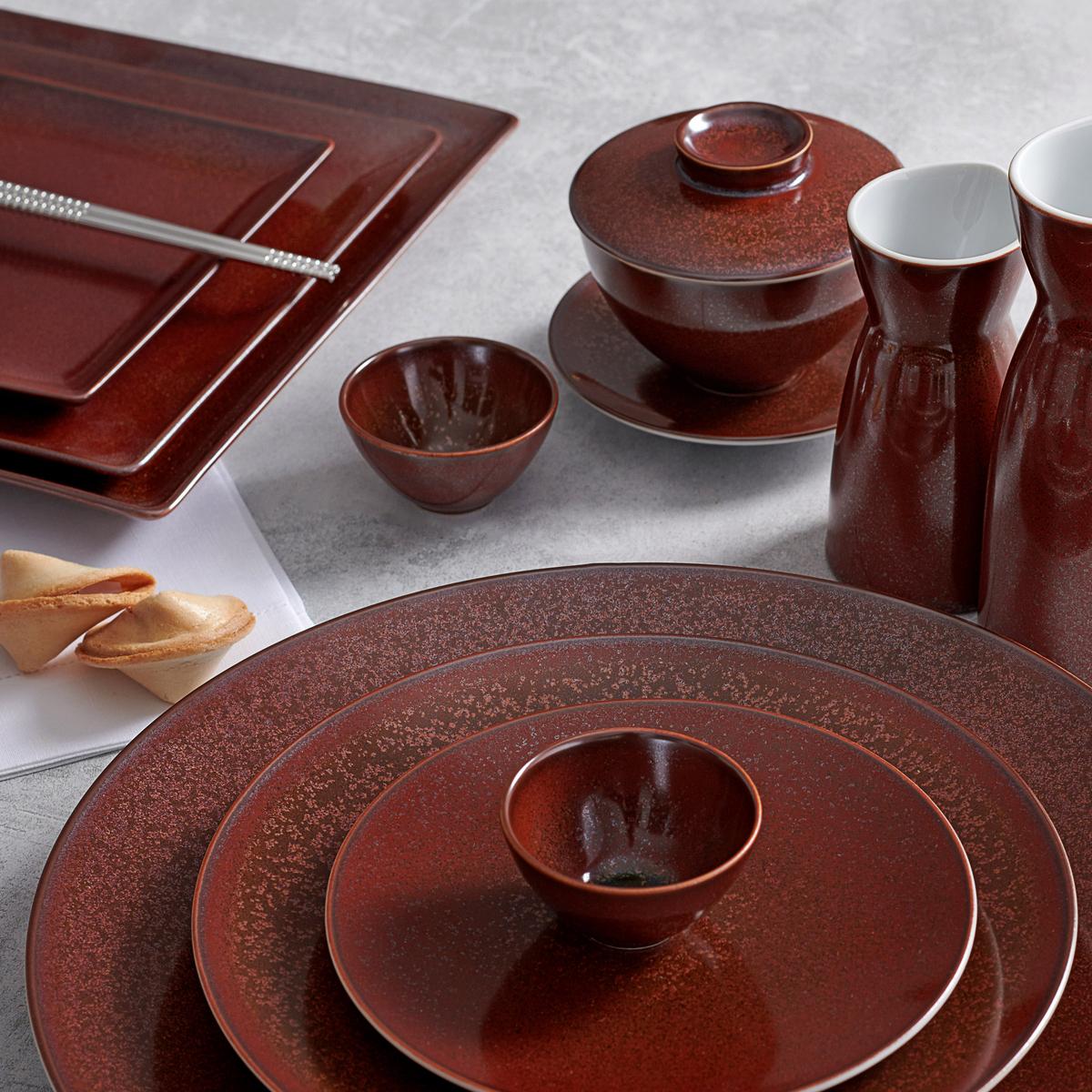 Unique colours, unique shapes. In addition to a large selection of round plates, cups, jugs, and bowls, the "Granite Rouge" dinner service also offers square plates in many different sizes. Porcelain items specially designed for Asian cuisine, such as sake jugs and sake bowls as well as Chinese teacups and spoons, make "Granite Rouge" the perfect dinner service for Asian-style table settings.