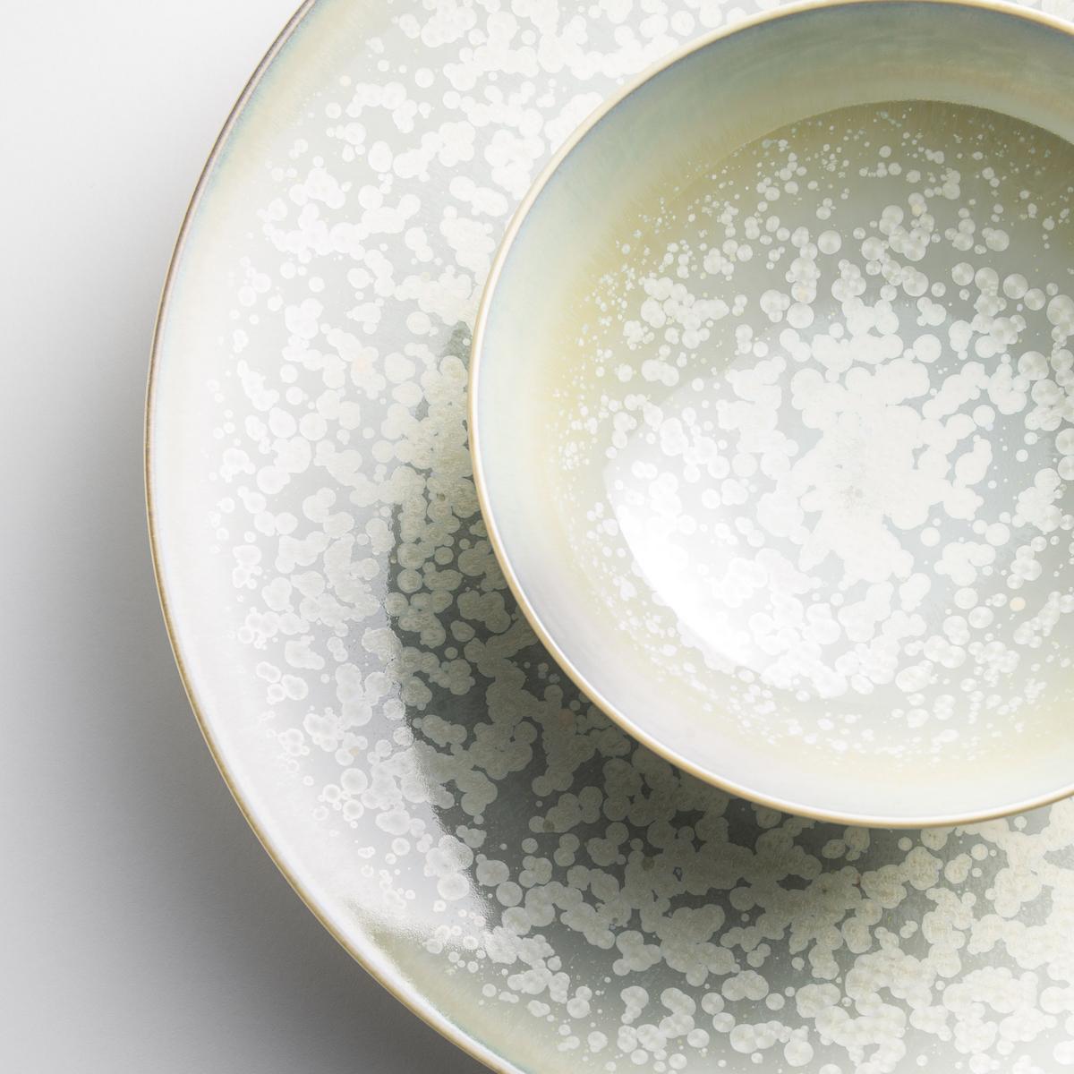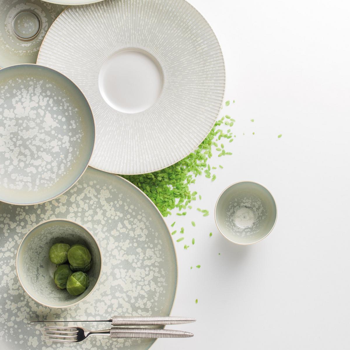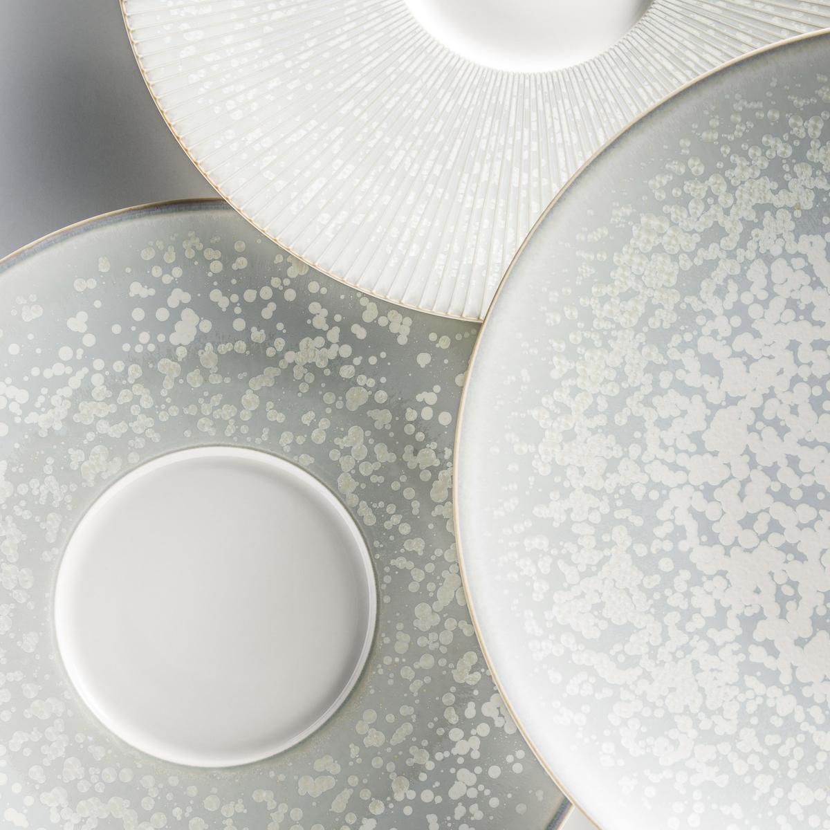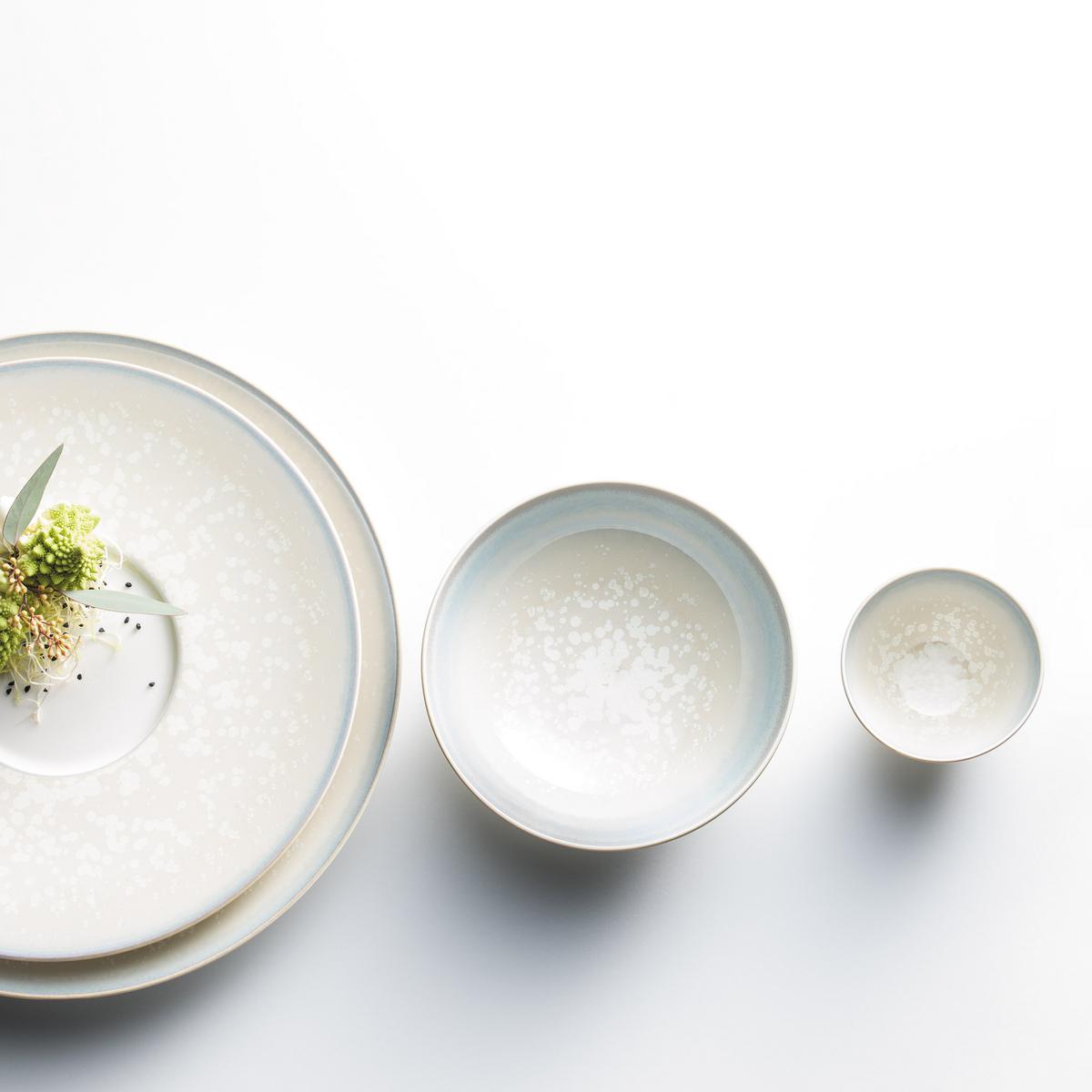 Organic, soft, and gentle. The "Song Perle" dinner service by Jaune de Chrome enchants with an innovative décor reminiscent of pearls and weathered shells. Like ancient rocks on the coastal shore, the pure Limoges porcelain seems to have taken on a slightly bluish and cream-coloured patina speckled with pearly spots.
