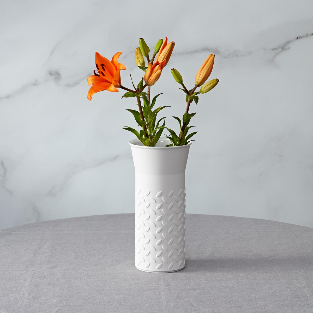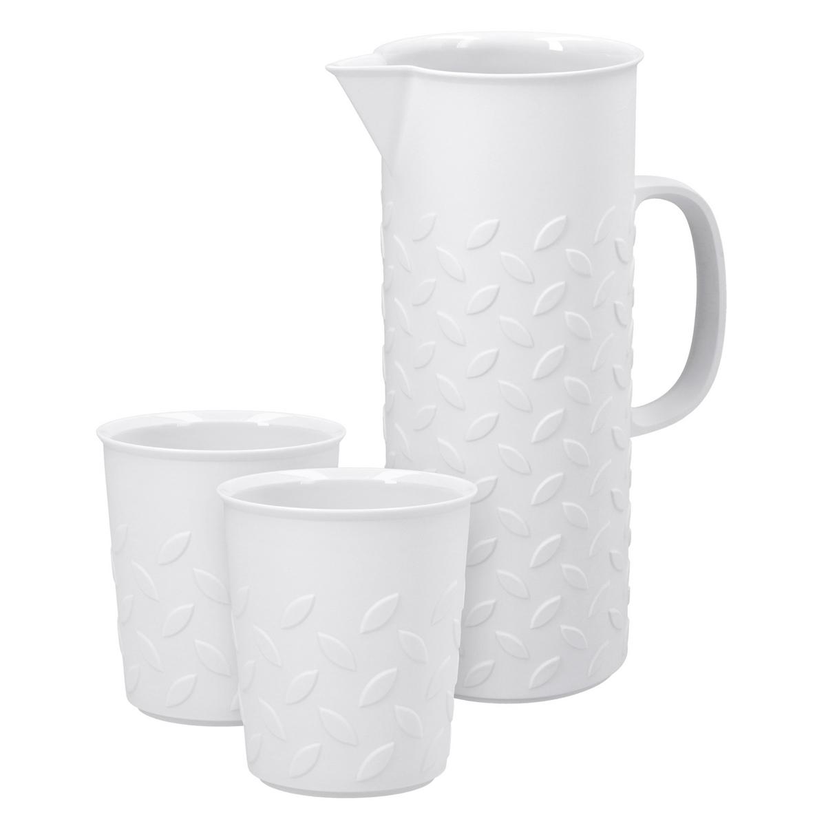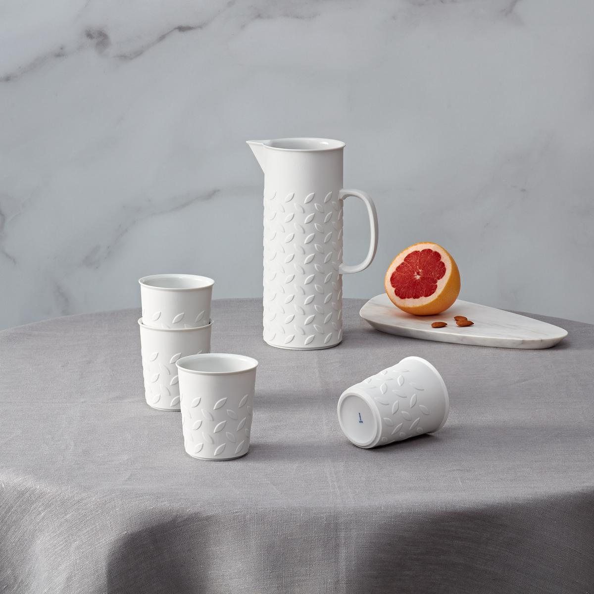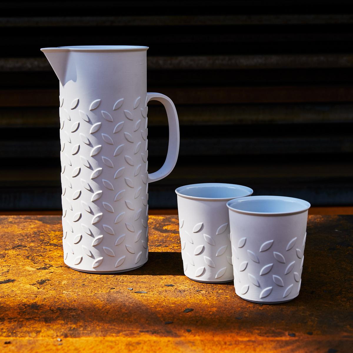 Wenzel devised the jug, mug and vase and sorted the "mandorlas" in a regular arrangement so that the viewer "self-experiences what he is actually looking at". The forms are beautiful and simple, but the relief-like feel creates an irritation that is remembered. The choice of bisque porcelain as the material emphasises the sharpness and accuracy."