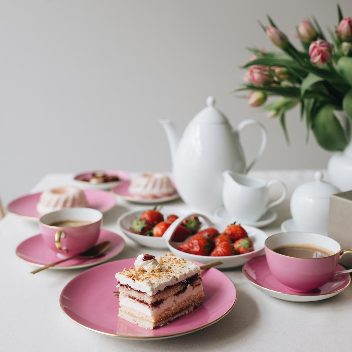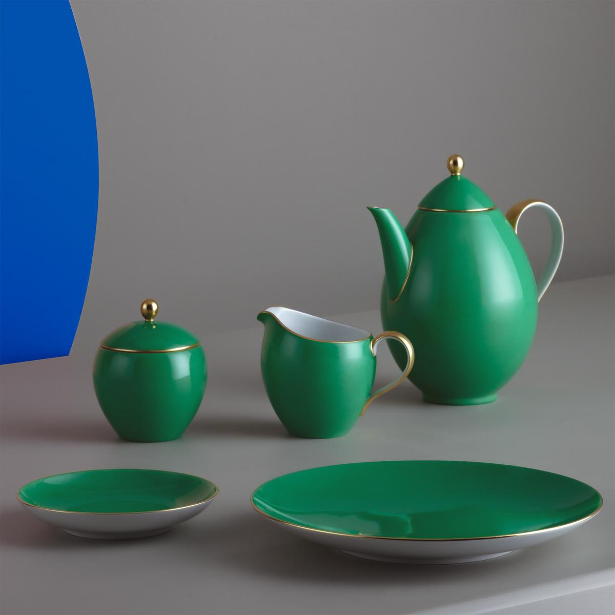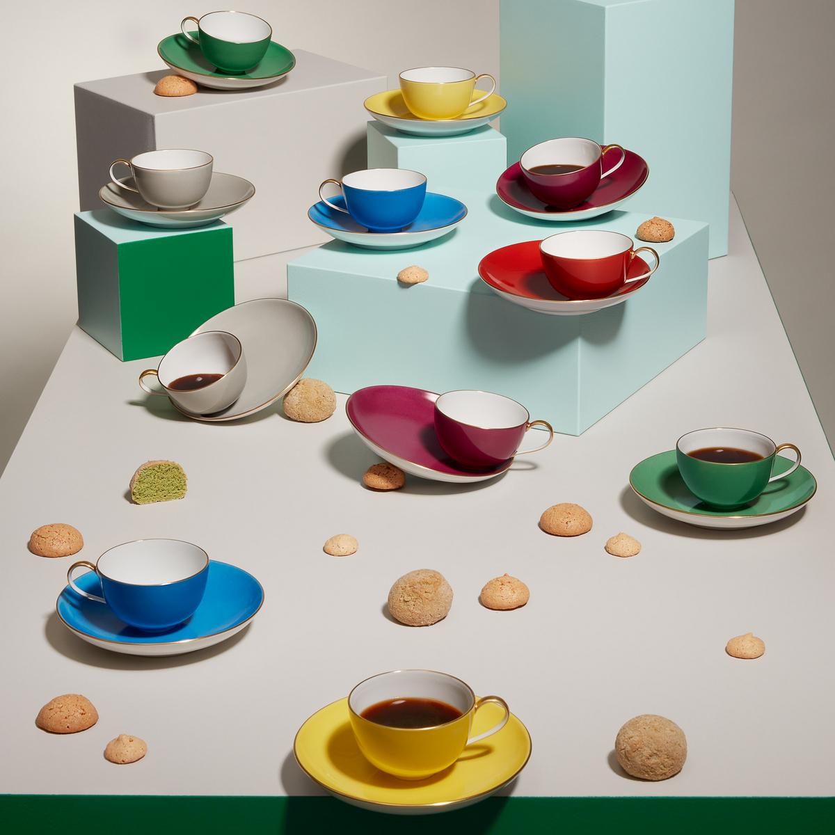 A traditional "dabbing" technique is used to decorate each piece – be it dark purple, iron red or lemon yellow – and provides an elegant colour accent. The design’s sophisticated pragmatism is refined with an elegant 24-carat gold line on the rim and handle.