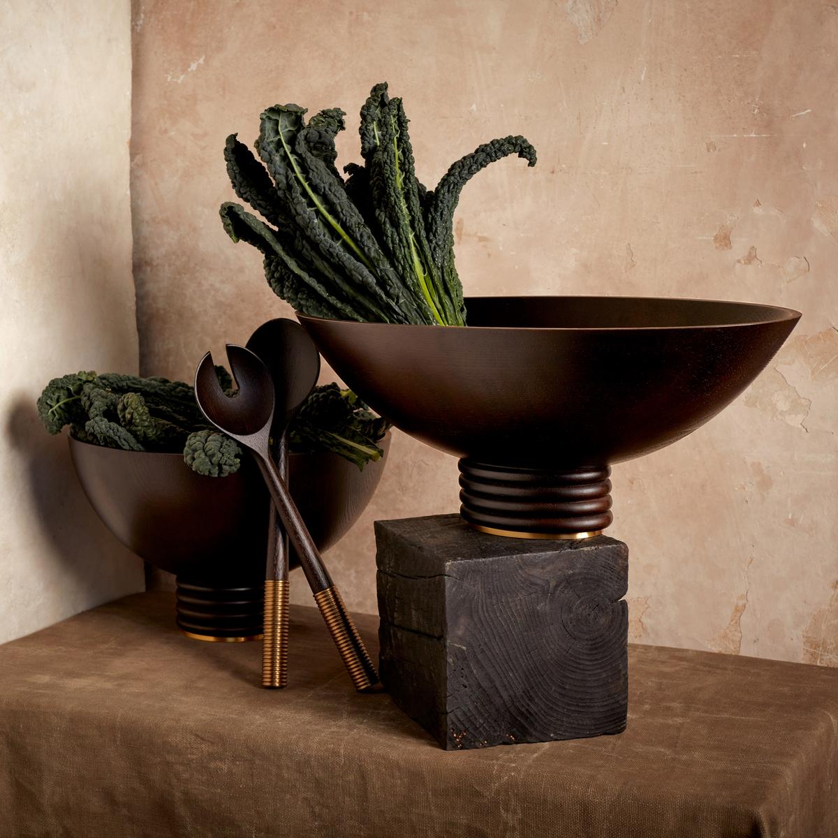 The oval "Alhambra" wooden bowl by L'Objet is a refined and elegant serving bowl made of fine smoked ash wood. The simple silhouette floats on a stacked wood pedestal with a sleek brass base.