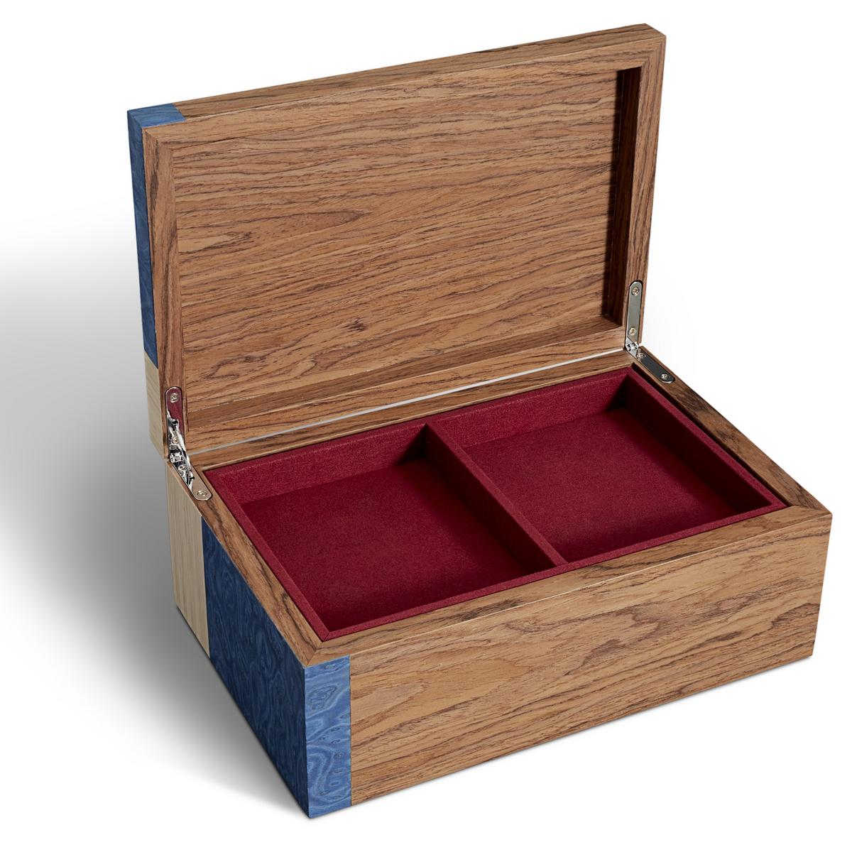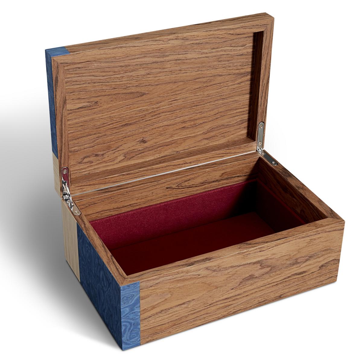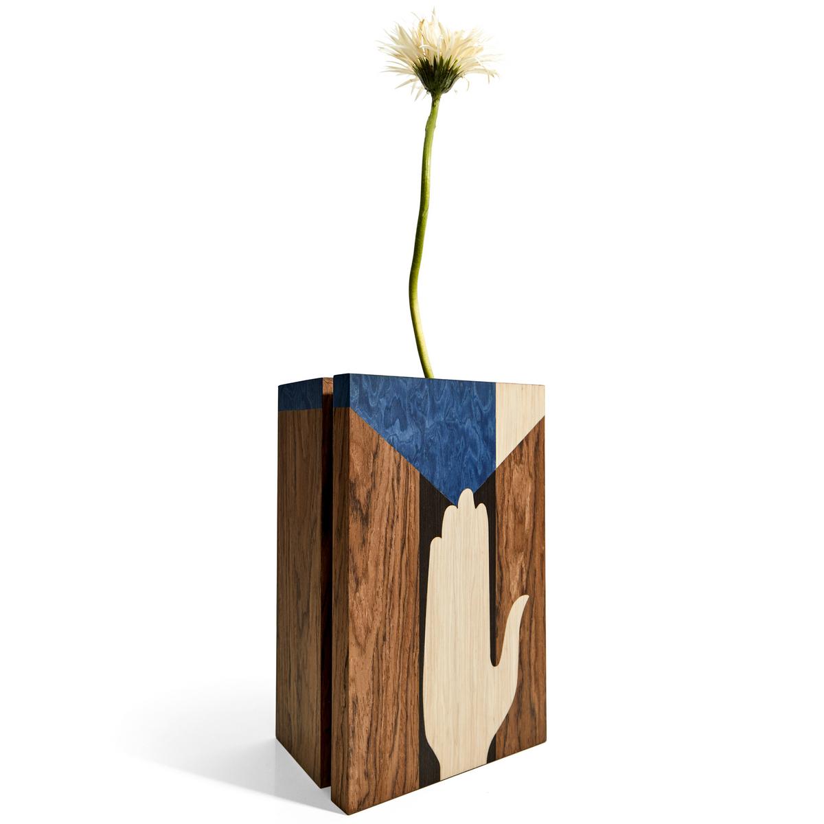 A protective hand for your spaces. The "Edgar" box by L'Objet reinterprets the hand symbol for protection, strength, and luck in a modern way. Made by hand in Portugal, the spellbinding décor is implemented as marquetry made of exotic woods. For this, artisans cut out individual shapes from carefully selected veneer sheets and join them together like a puzzle before attaching the finished veneer to the object. The removable shelf and the lower half of the interior are covered with red fabric to keep jewellery, small valuables and precious mementos safe and sound.