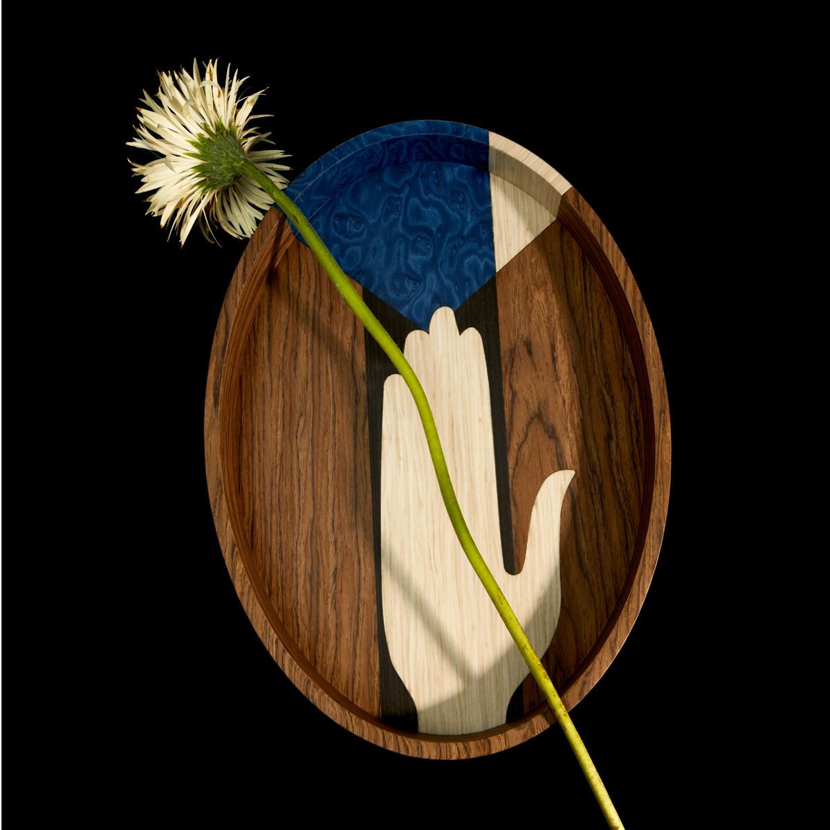 A protective hand for your spaces. The "Edgar" oval tray by L'Objet reinterprets the hand symbol in a modern way. Made by hand in Portugal, the symbol for protection, strength, and luck is implemented on the tray as marquetry made of exotic woods. For this, artisans cut out individual shapes from carefully selected veneer sheets and join them together like a puzzle before attaching the finished veneer to the object. Use the modern designer piece to entertain guests or as a decorative talisman.