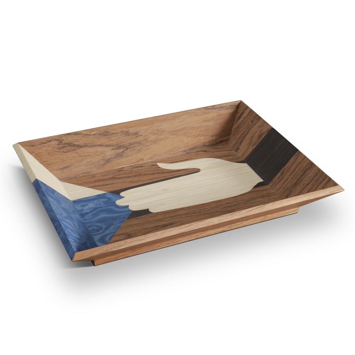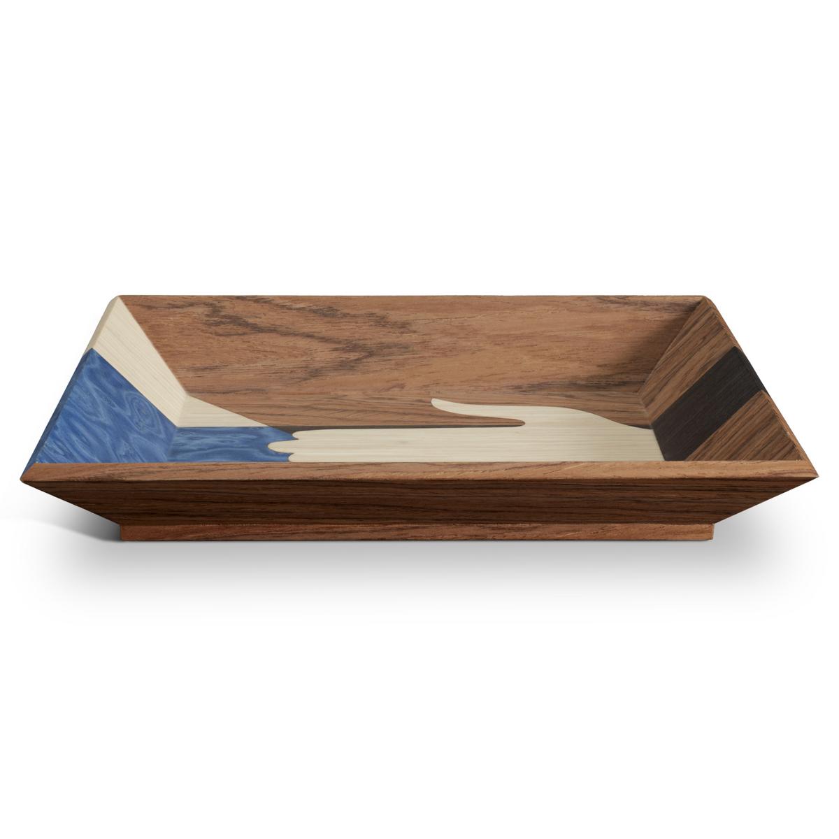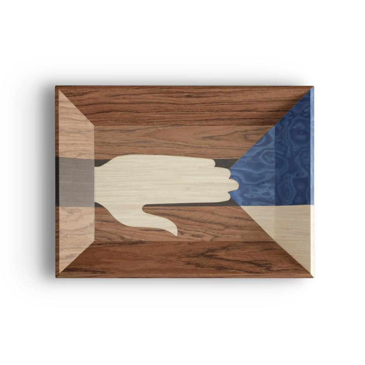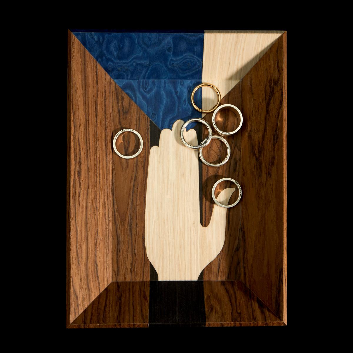A protective hand for your spaces. The "Edgar" vide-poche by L'Objet reinterprets the hand symbol in a modern way. Made by hand in Portugal, the symbol for protection, strength, and luck is implemented on the vide-poche as marquetry made of exotic woods. For this, artisans cut out individual shapes from carefully selected veneer sheets and join them together like a puzzle before attaching the finished veneer to the object. The modern designer piece welcomes you in the entrance area or on your desk as a storage tray for your keys, smartphone, wallet and jewellery.