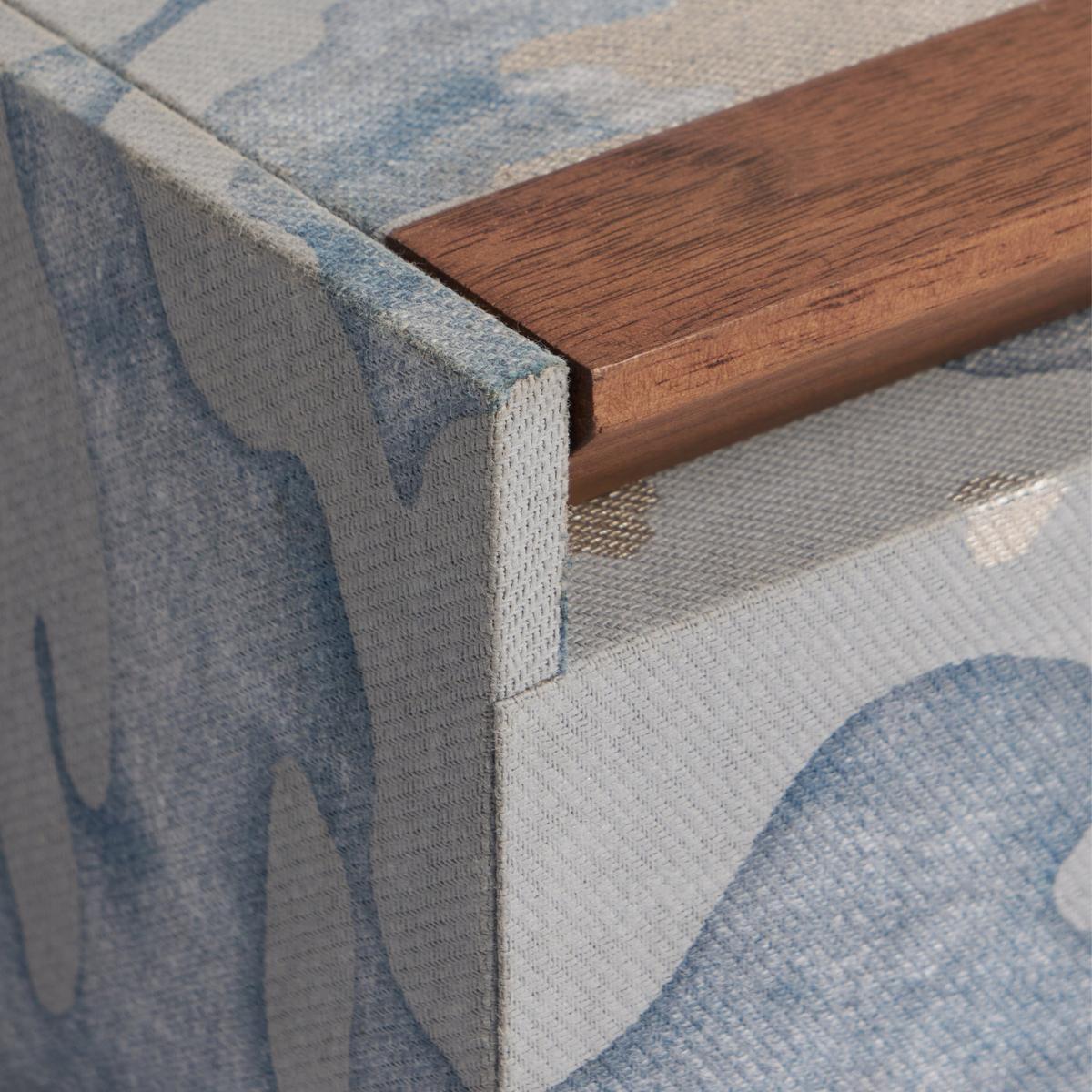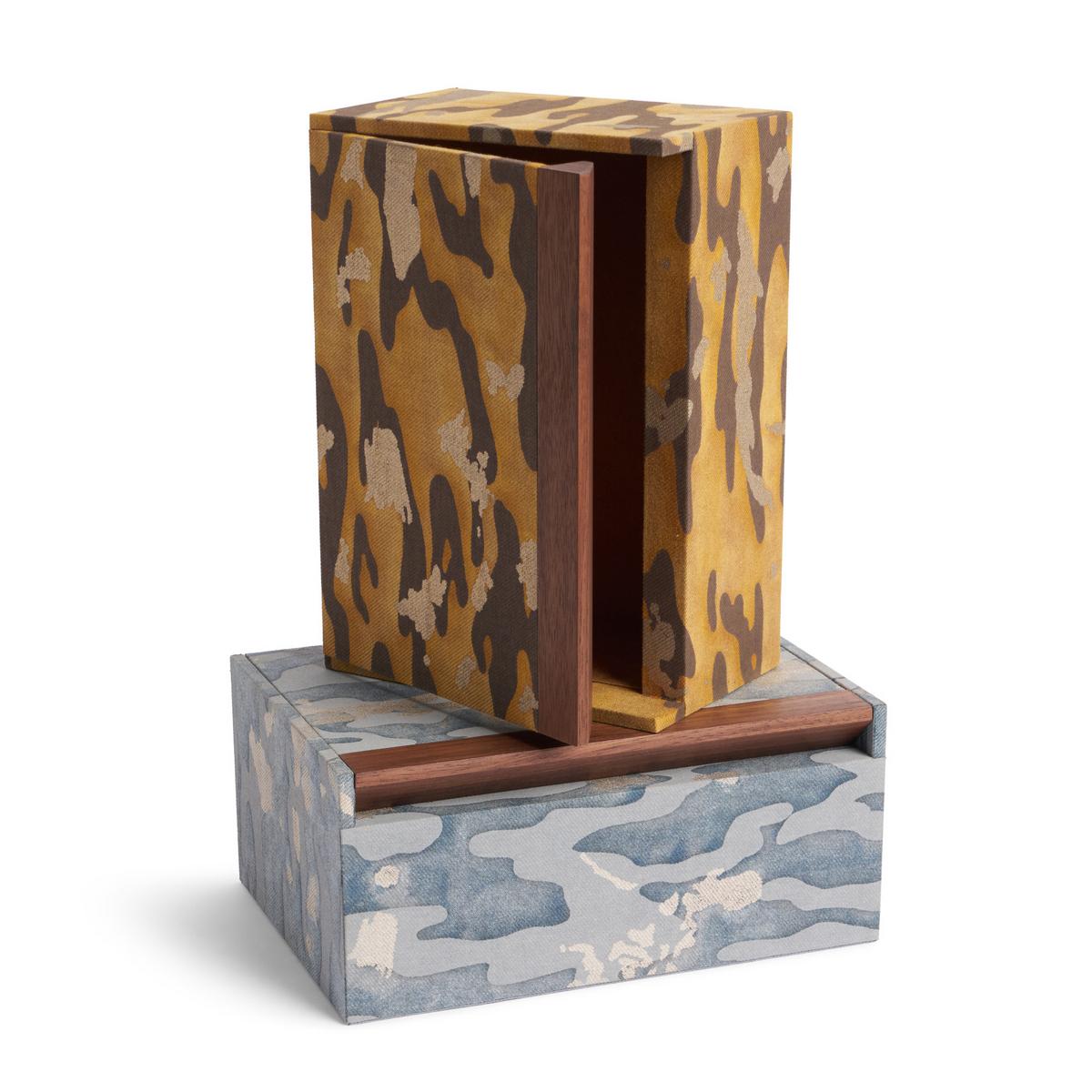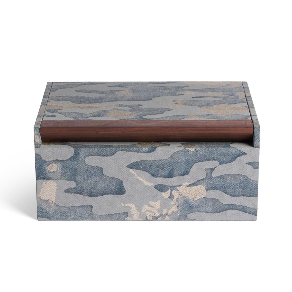 The "Fortuny" boxes by L’Objet transcend storage to become true works of art. Each box is wrapped in the iconic "Camo Isole" fabric by Fortuny, a design that echoes the rich heritage of Mariano Fortuny, inspired by Venice and infused with Renaissance artistry. Crafted from walnut wood and finished with a suede lining, these boxes embody elegance and refinement.