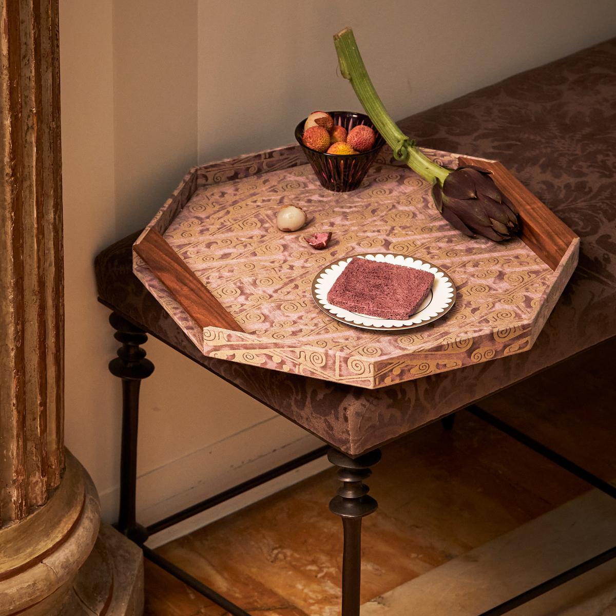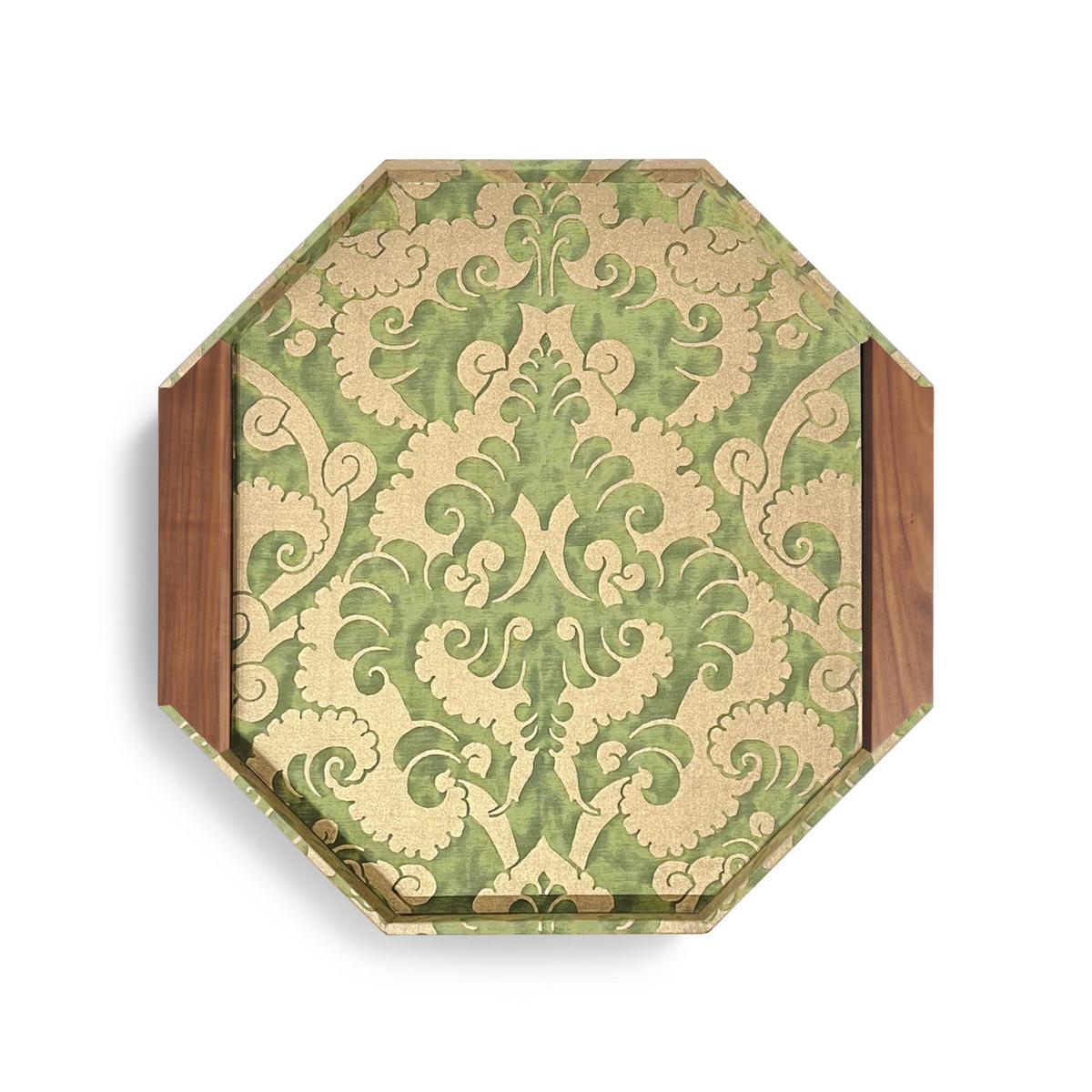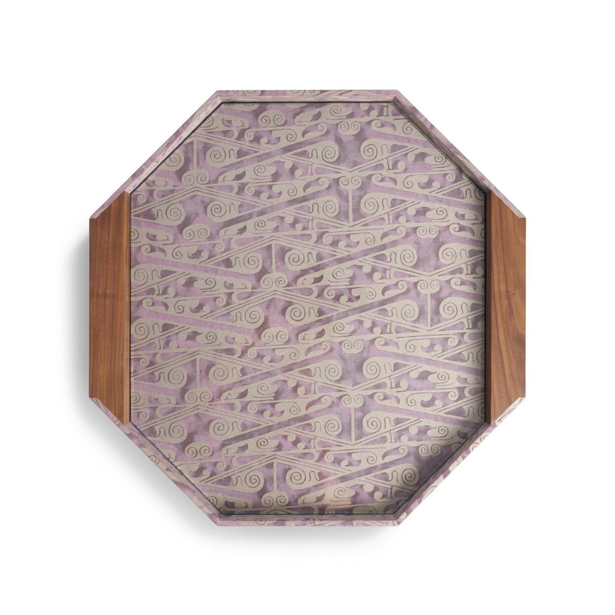 The octagonal "Fortuny" trays by L’Objet combine striking geometry with the timeless elegance of Fortuny’s legendary Venetian textiles. Each piece is wrapped in richly patterned fabric — crafted with Fortuny’s signature depth of tone and subtle metallic sheen — and framed by sculpted walnut wood for a warm, architectural finish.
