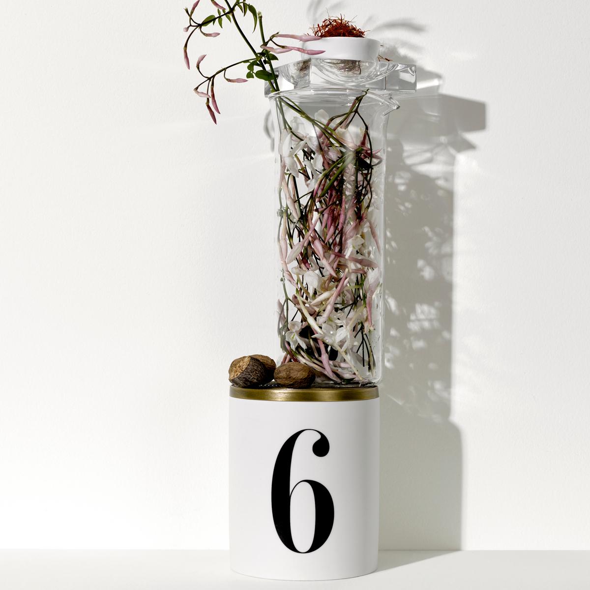 The "Jasmin d’Inde no. 6" scent conjures up the many fragrances of an Indian market. The head note of "Jasmin d’Inde no. 6" is a combination of saffron, cumin and nutmeg, the heart note of powerfully fragrant jasmine blossoms, while the base note is of patchouli, sandalwood and birch extract.