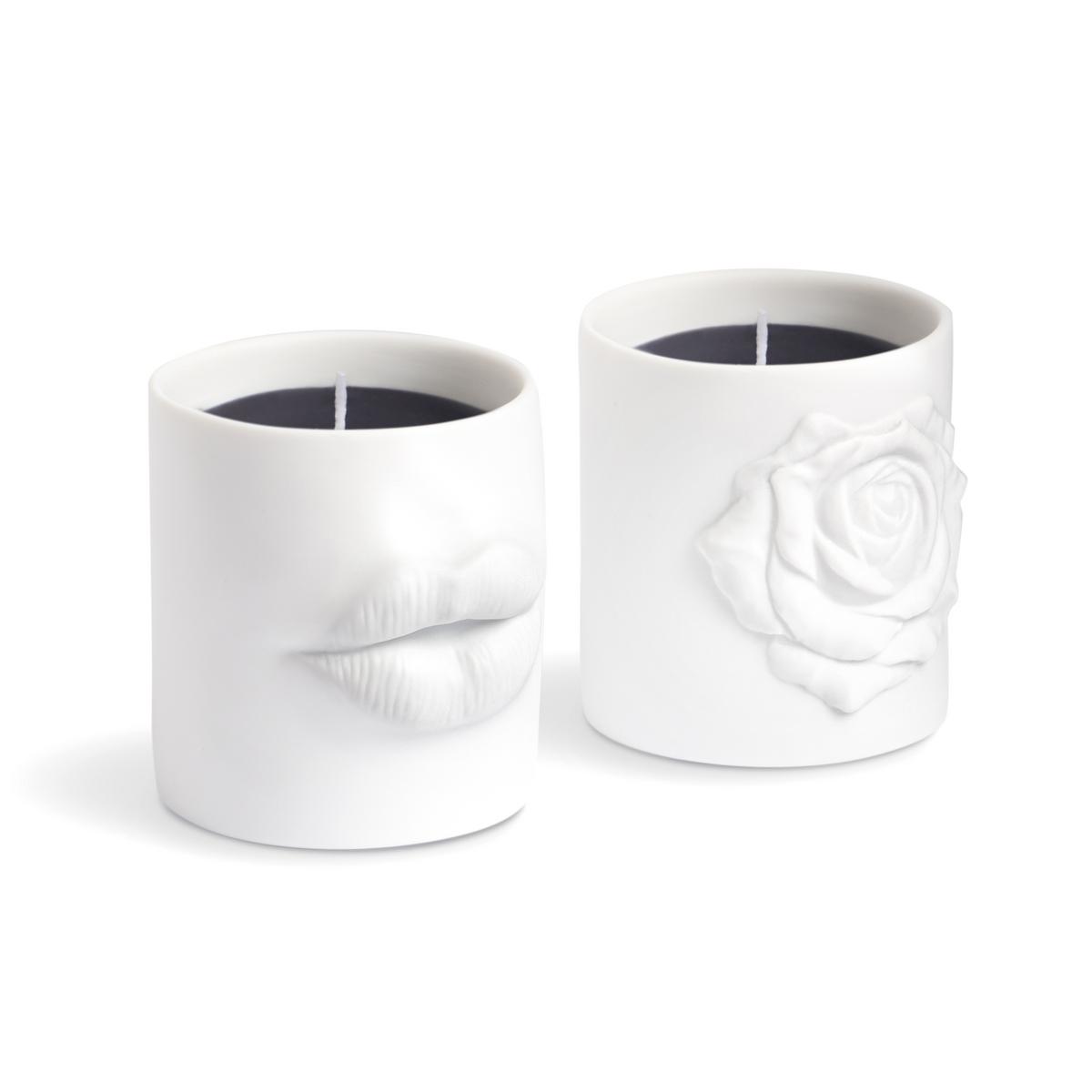 A touch of luxury captured in porcelain and scent: This exquisite set by L’Objet brings together two artful mini scented candles in an iconic design. Each candle is crafted from matte white porcelain and adorned with a unique relief – sensual lips on one, a finely detailed rose on the other. The texture is not only visually striking but also a tactile delight.