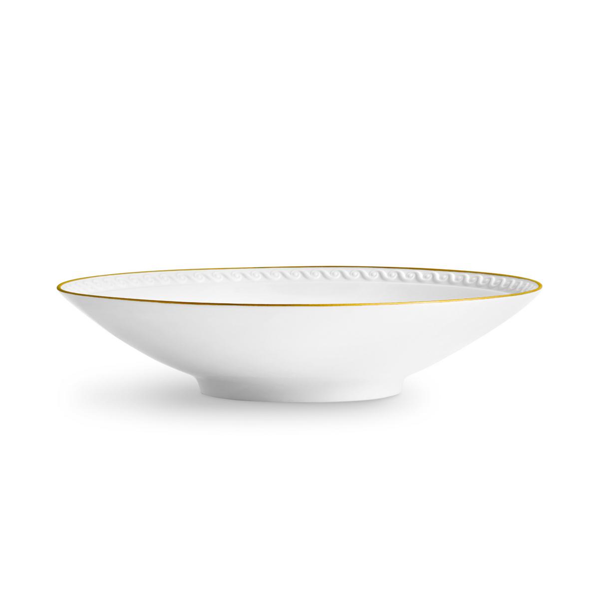 Inspired by the timeless beauty of the sea, the neoclassical motif of the "Neptune" dinner service from L'Objet is carefully handcrafted from fine porcelain and hand-painted in 24k gold to reflect the gentle waves of the Mediterranean. The artistic relief structures adorn the rims made of fine bisque porcelain from L'Objet.