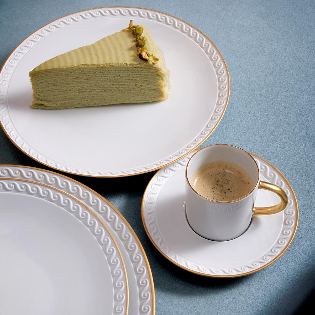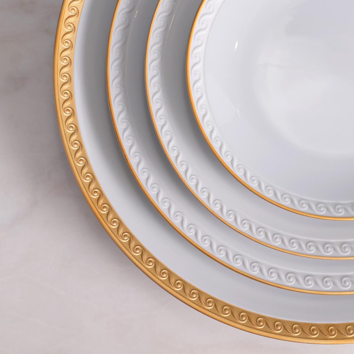 Inspired by the timeless beauty of the sea, the neoclassical motif of the "Neptune" dinner service from L'Objet is carefully handcrafted from fine porcelain and hand-painted in 24k gold to reflect the gentle waves of the Mediterranean. The artistic relief structures adorn the rims made of fine bisque porcelain from L'Objet.