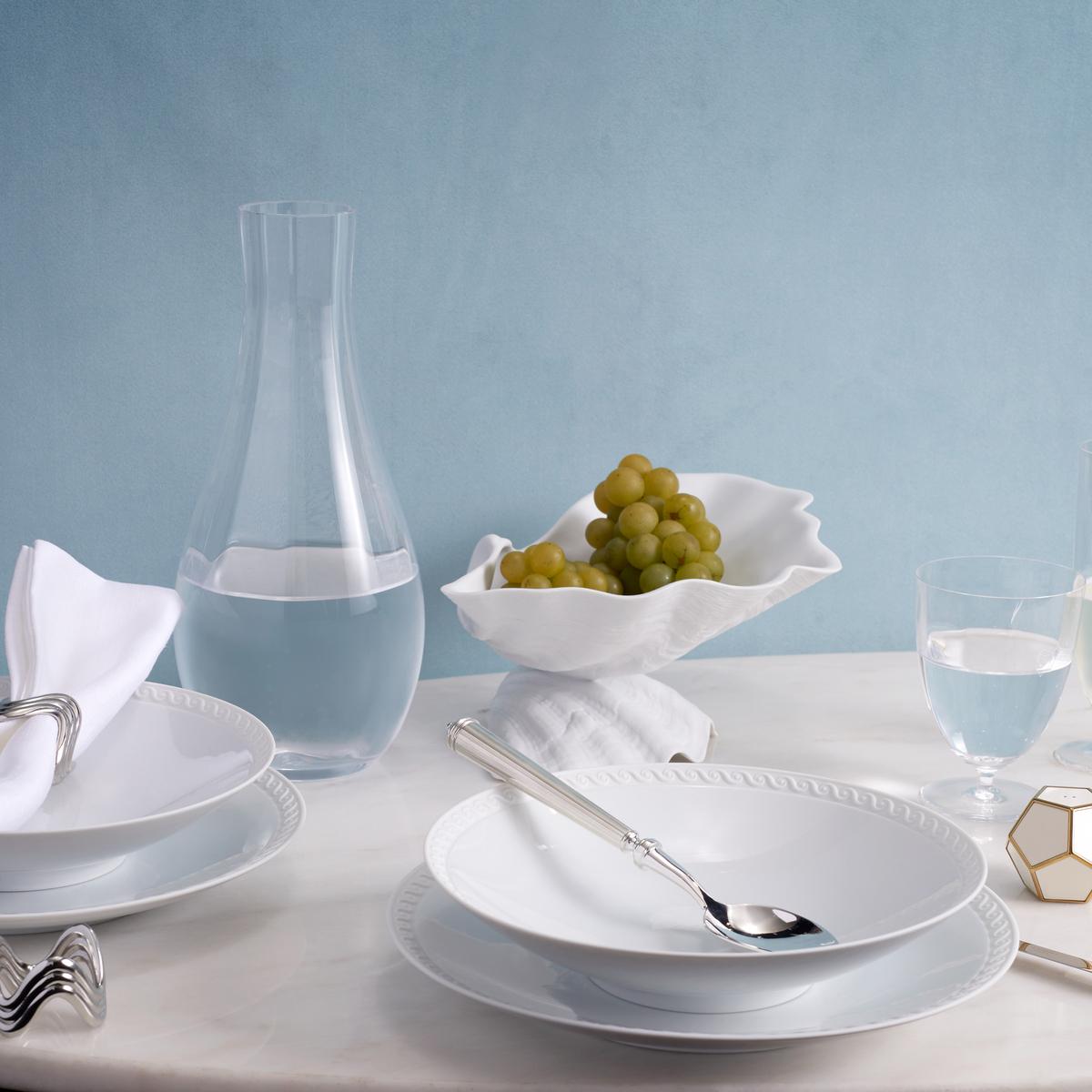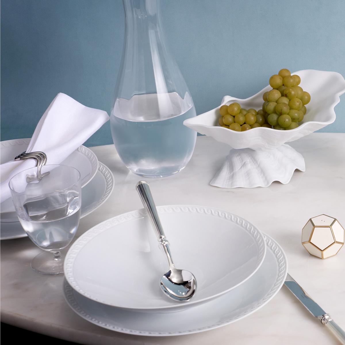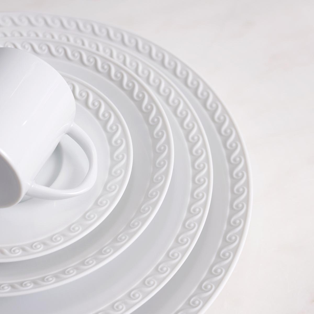 Inspired by the timeless beauty of the sea, the neoclassical motif of the "Neptune" dinner service from L'Objet is carefully handcrafted from fine porcelain to reflect the gentle waves of the Mediterranean. The artistic relief structures adorn the rims made of fine bisque porcelain from L'Objet.