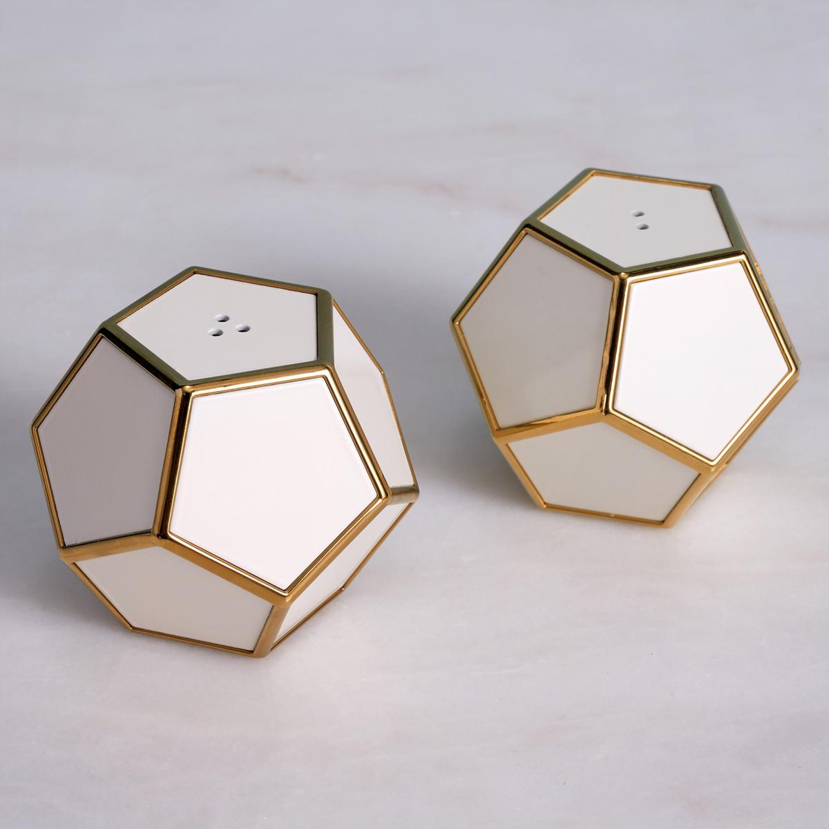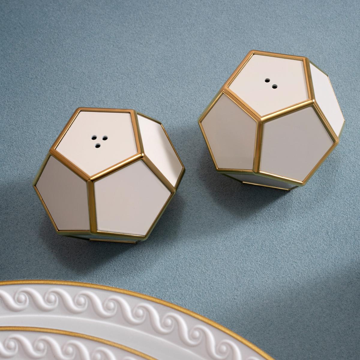 The "Pentagon" salt and pepper shakers are made of white enamel and adorned with gold-plated details that emphasize the shaker's shape.