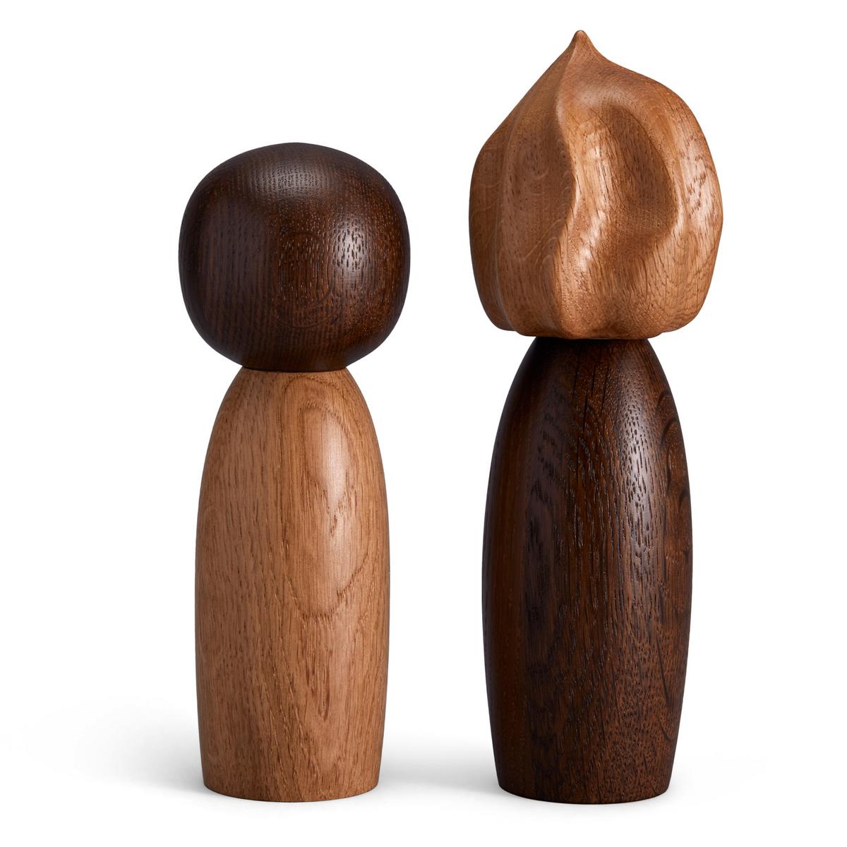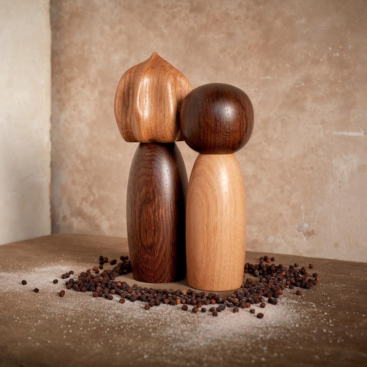 The "Picanto" salt and pepper mills from L'Objet are hand-carved from natural European oak and smoked oak and have abstract shapes reminiscent of the flakes of salt and pepper grains. Each mill is equipped with a high-quality metal grinding mechanism.