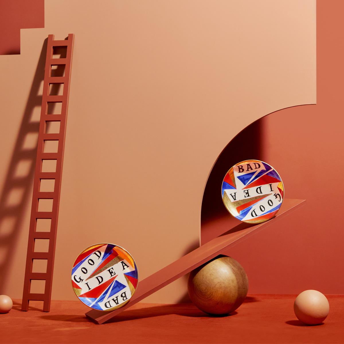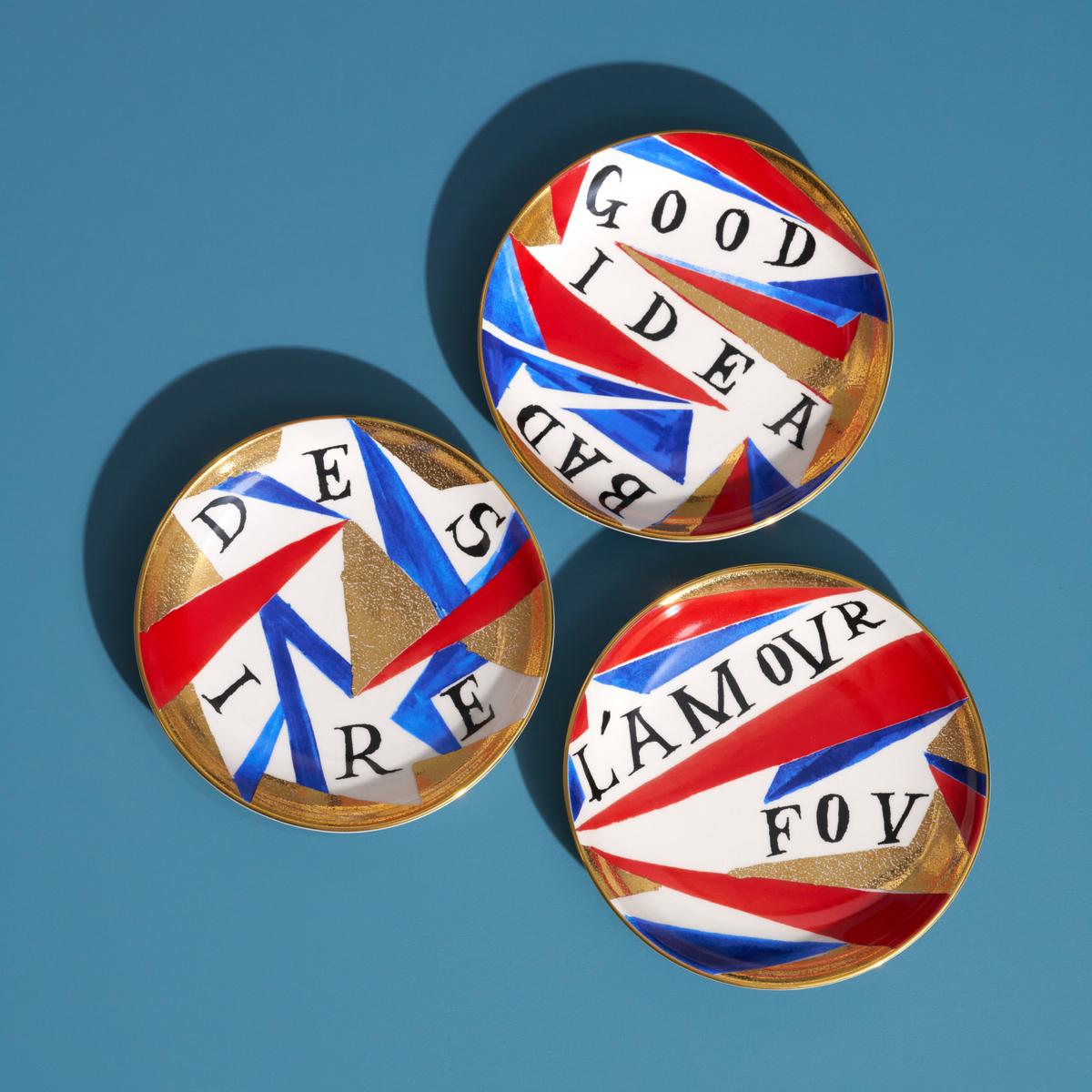 The playful messages reflect Hoffmann’s signature style – ironic, emotional, and full of character: "Good idea / Bad Idea", "Desire" and "L'amour fou". Whether used as a cocktail plate, jewelry catchall, or decorative accent, these pieces bring wit and color to any space. Each plate is sold individually and comes in a beautifully designed gift box – perfect for giving or collecting.