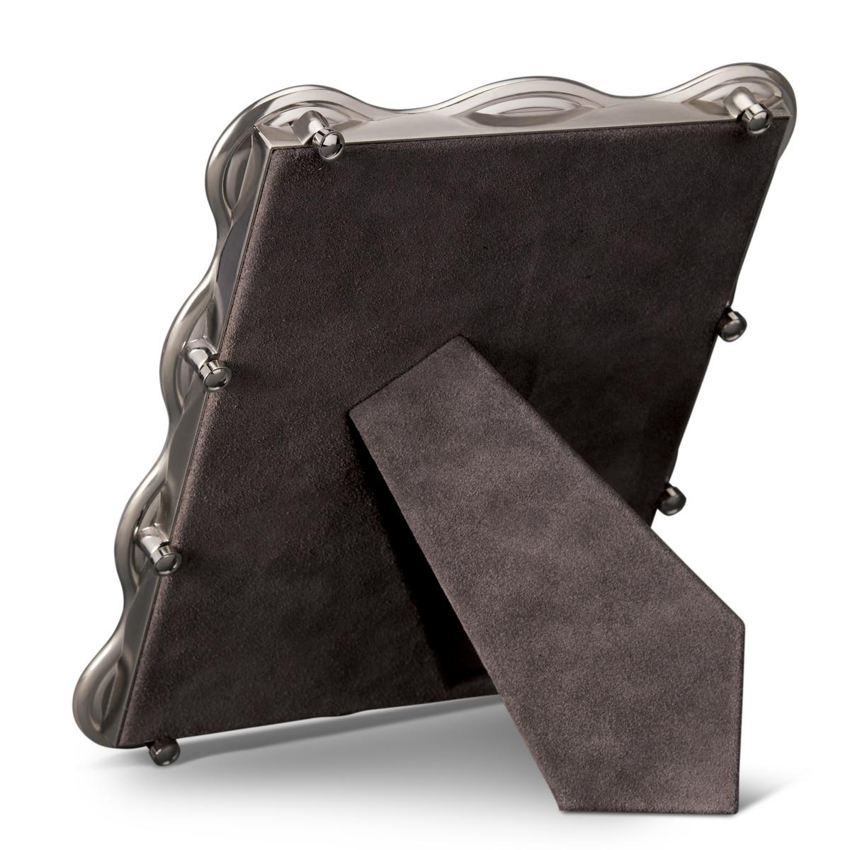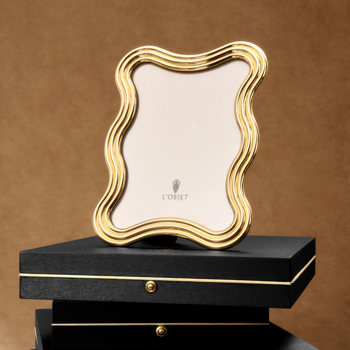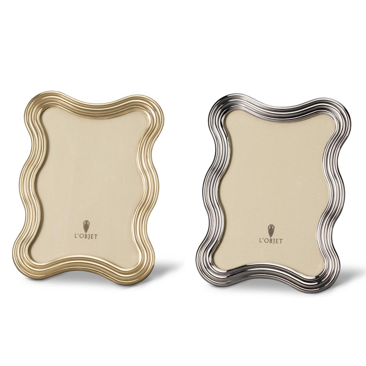 A frame that makes waves. The "Ripple" picture frames by L'Objet capture the vibe of the 70s with a groovy ripple effect. The signature leather back of L'Objet perfectly matches the frame's casually elegant vintage style. Choose from a 24-carat gold-plated or platinum finish in three different sizes each to find the perfect picture frame for your most precious keepsake photos.