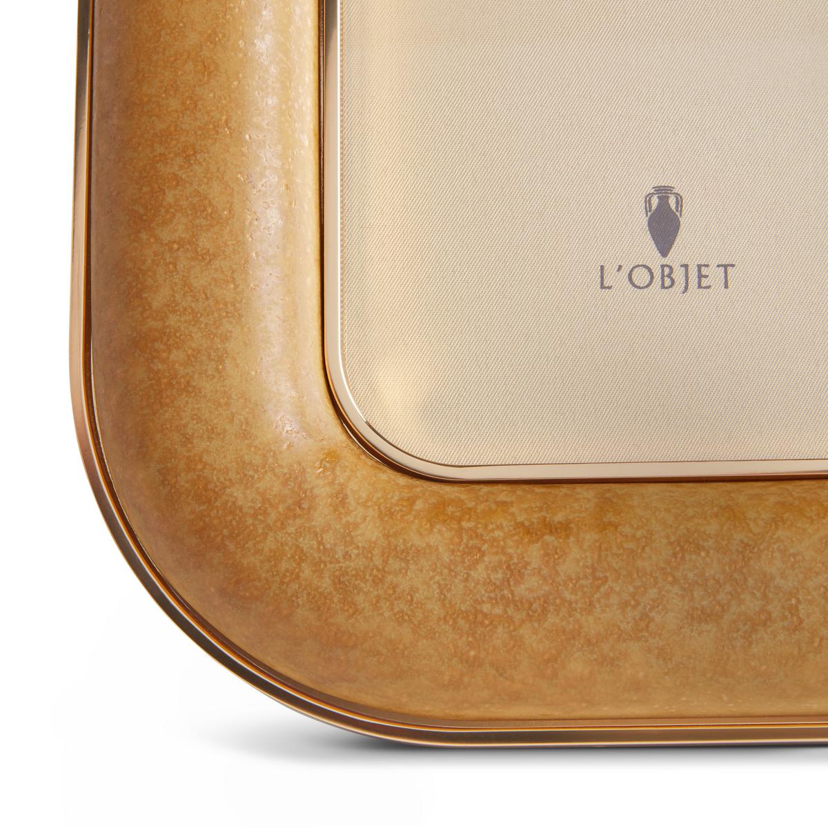 Each frame is crafted from ceramic with a reactive glaze, giving every piece its own unique depth of color and texture. A fine 24-karat gold-plated rim adds a luminous accent, elegantly highlighting the image within. The reverse side is finished in supple leather, ensuring the frames are as beautiful from the back as they are from the front.