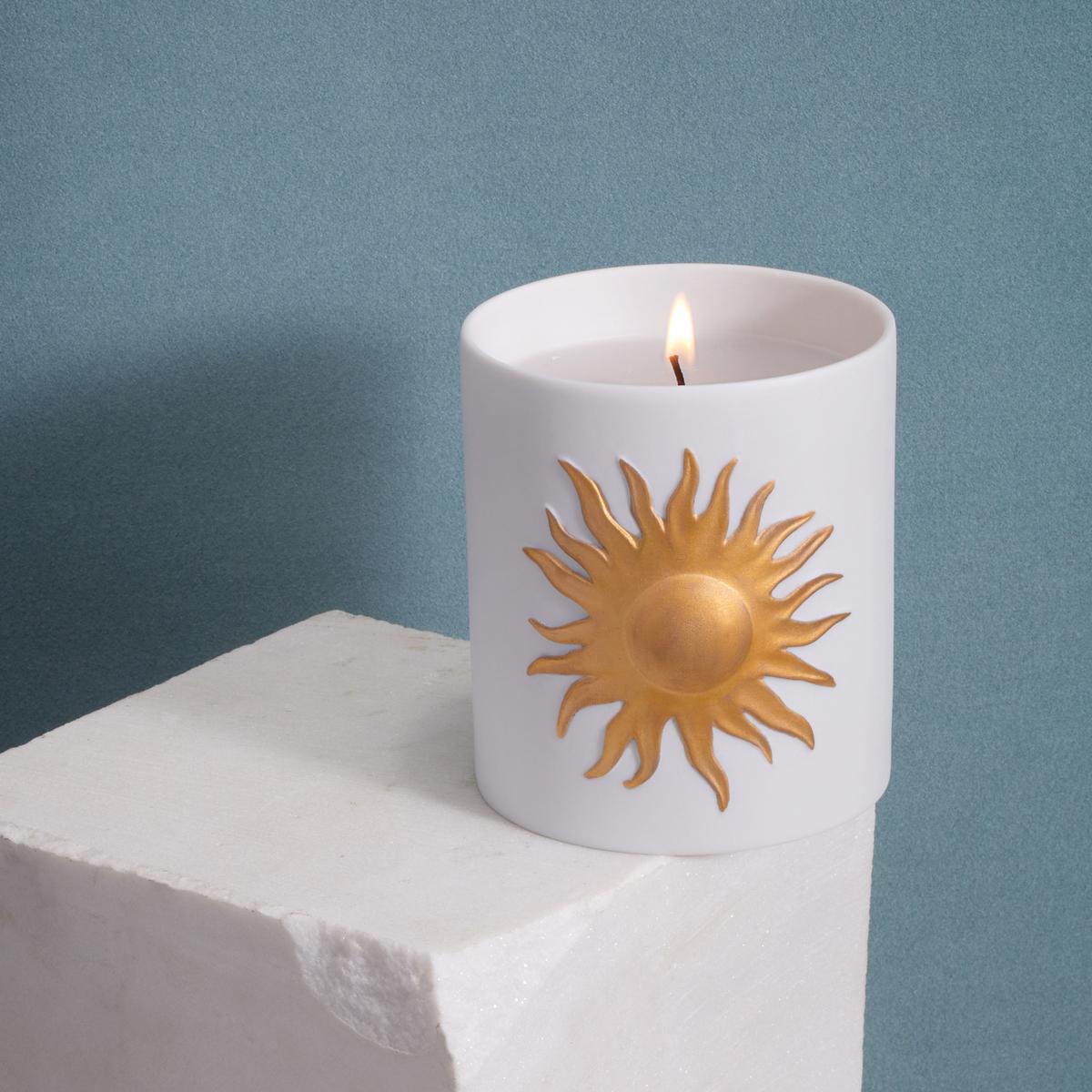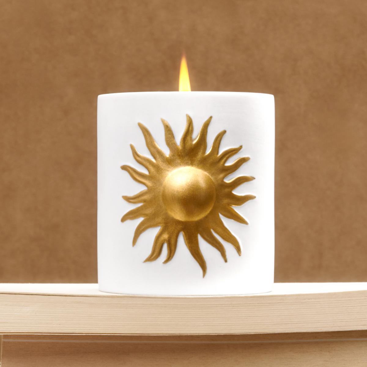 The "Soleil" scented candle from L'Objet is more than just a pleasant room fragrance. It is a small work of art made from the finest porcelain and decorated with 24-carat gold. The porcelain vessel is adorned with a sculpted sun in gold.