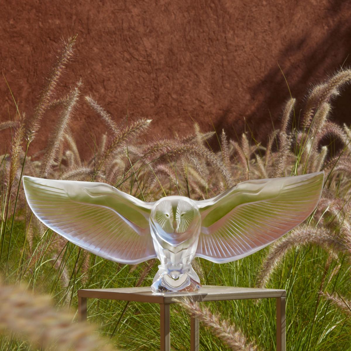On the trail of the kingdom of animals. The "Barn Owl" sculptures by Lalique capture the moment just before the silent hunter seizes its prey in full flight. With a wingspan of 42 centimetres, the crystal sculptures are awe-inspiring masterpieces. Satin-finishing and repolishing the sculptures are technical challenges during which the majestic wings could break at one false move. Details such as the eyes, beaks and talons stand out with a clear surface and lend the barn owls a fiery liveliness. The bronze-coloured version is additionally refined with a gold lustre.