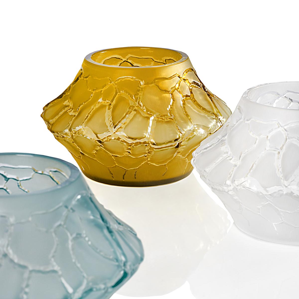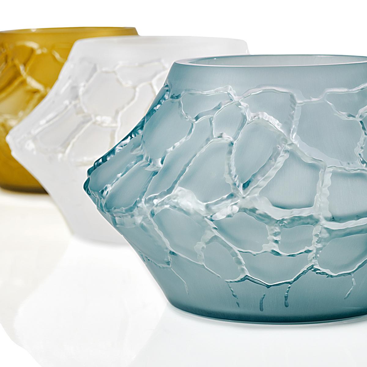 Shaped by time. The "Caldera" vases and votives by Lalique are inspired by the organic craquelure of dry earth. Like a slow breath, a gentle mosaic of clear cracks breaks through the satin-finished surfaces of the small crystal vases, whose shape is modelled on a volcanic crater. The interplay of matt and clear creates an intriguing sense of depth, emphasising the thickness of the fine crystal glass and creating unique plays of light, especially when used as a votive.