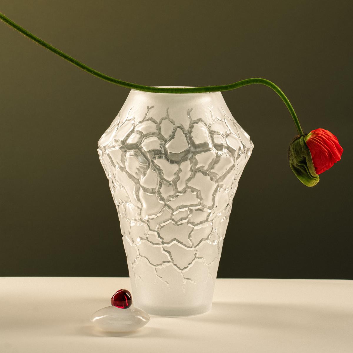 Shaped by time. The "Caldera" vases by Lalique are inspired by the organic craquelure of dry earth. Like a slow breath, a gentle mosaic of clear cracks breaks through the satin-finished surfaces of the crystal vases, whose shape is modelled on a volcanic crater. The interplay of matt and clear creates an intriguing sense of depth, emphasising the thickness of the fine crystal glass and creating unique plays of light. The vases are available in clear and in Canyon, a colour that symbolises the earth with its many shades and is reminiscent of vast rocky landscapes.
