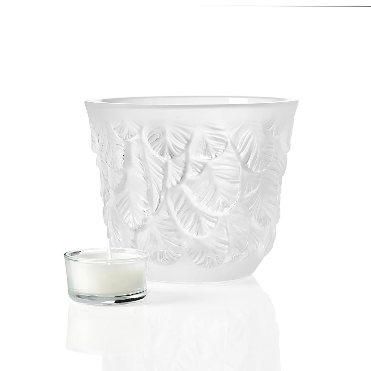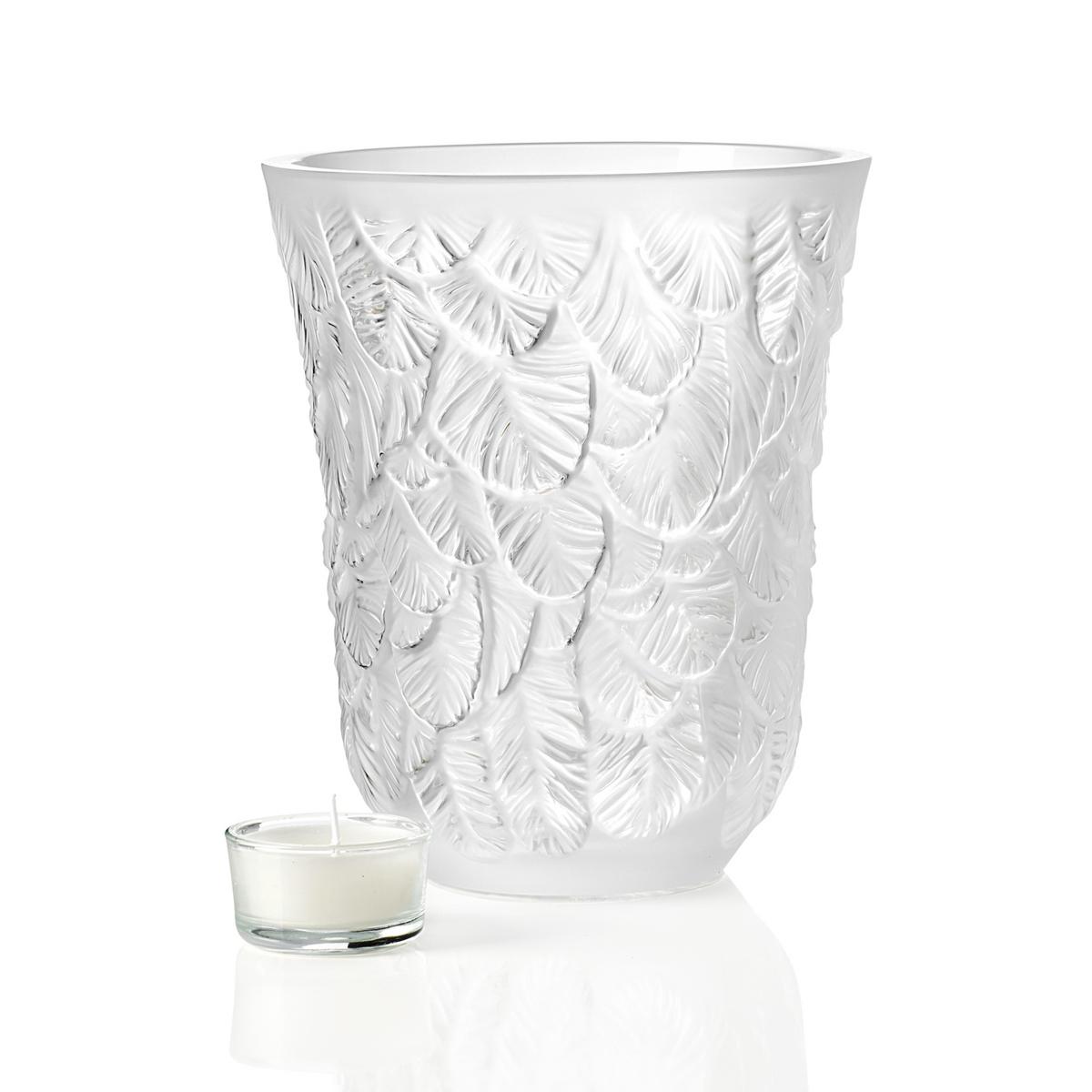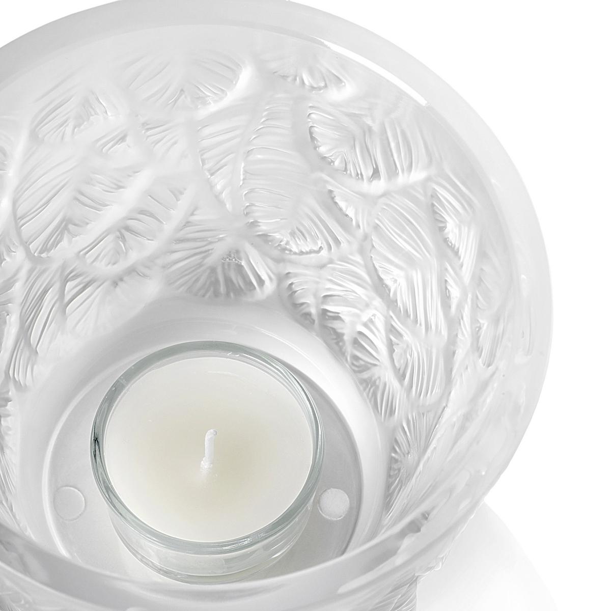 On the trail of the kingdom of animals. The "Grand-Duc" votives by Lalique bear the magnificent plumage of the stately Great Horned Owl, the tiger of the air. The elaborate feather pattern is first sandblasted for a matt finish, followed by a re-polishing by hand. This double treatment unveils the true wealth of details of the dense plumage. Enjoy warm and soft candlelight shimmering softly through the precious crystal – a majestic work of glass art fit for the most beautiful tables.
