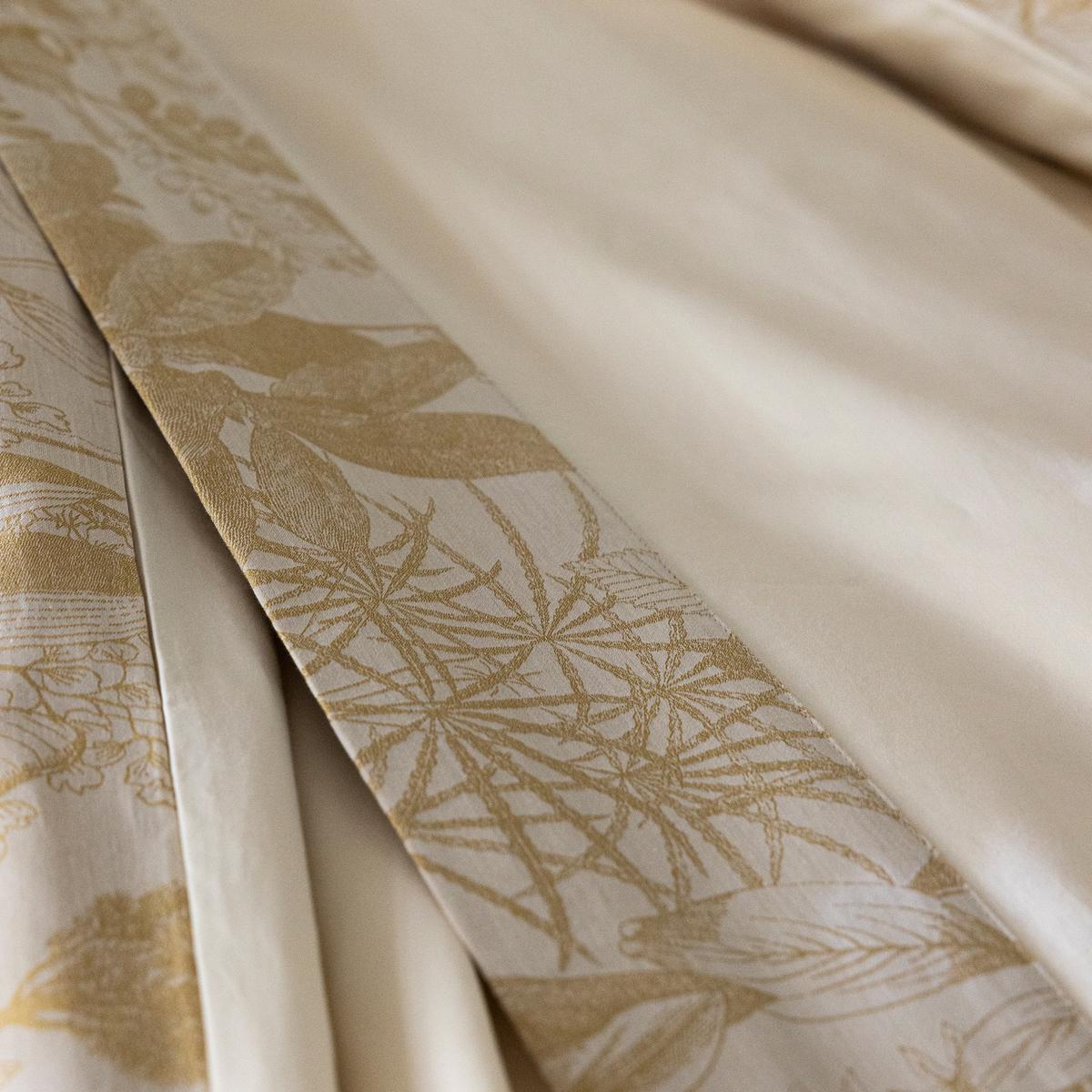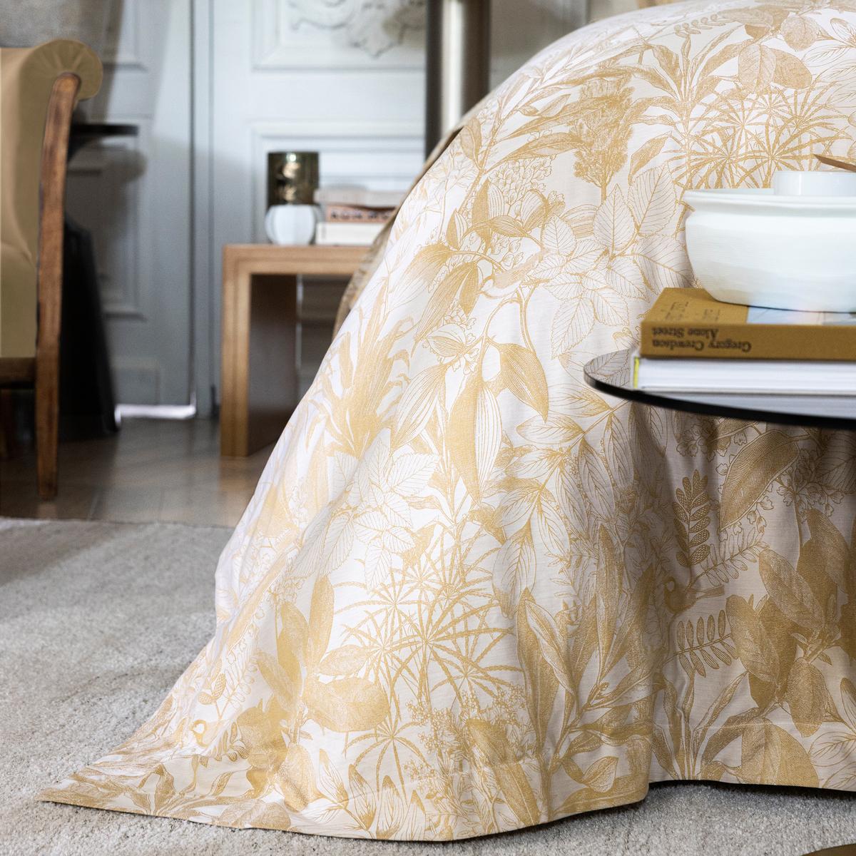 With the "Bois Dormant" bed linen by Le Jacquard Français, your bedroom becomes a luxurious retreat. The front side reveals a finely woven design of delicate leaves and small birds, shimmering in elegant ivory and radiant golden tones. The reverse side is kept plain, allowing the refined pattern to take center stage.