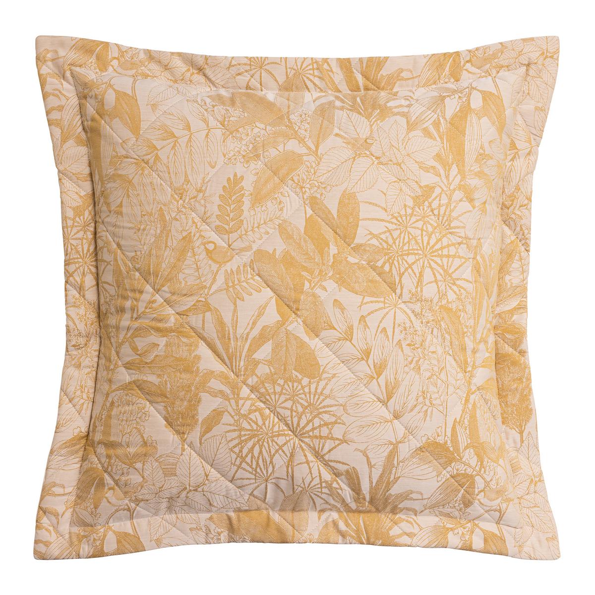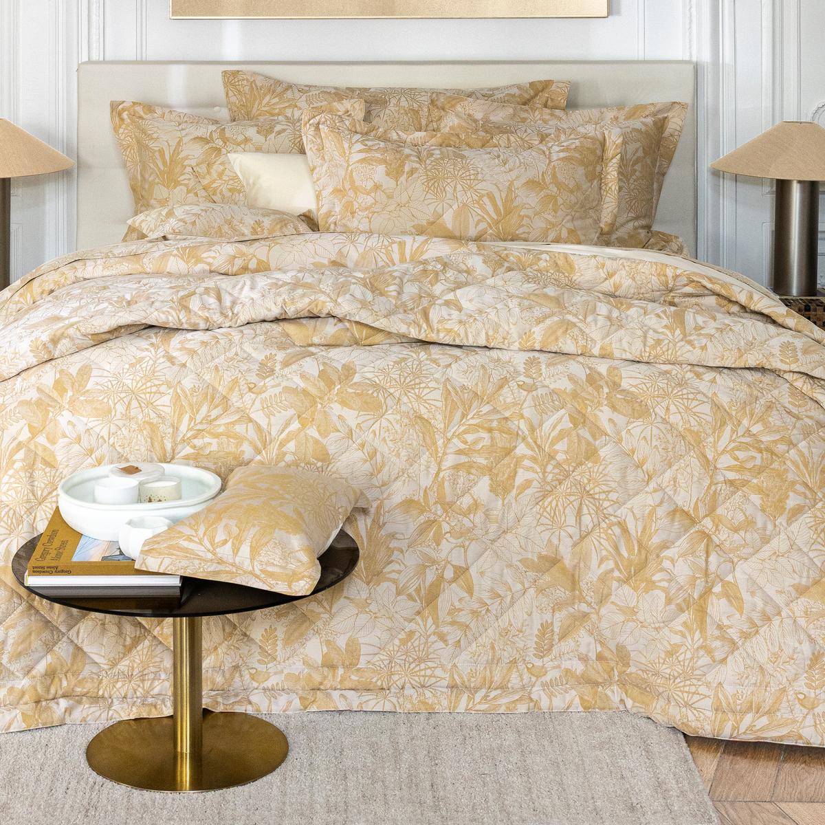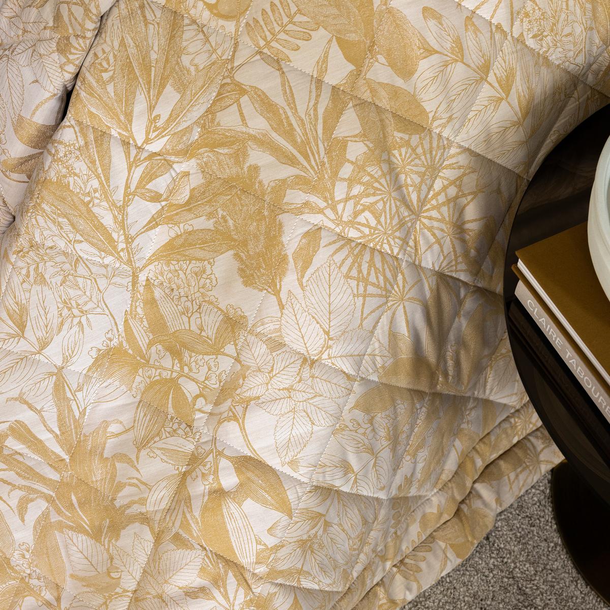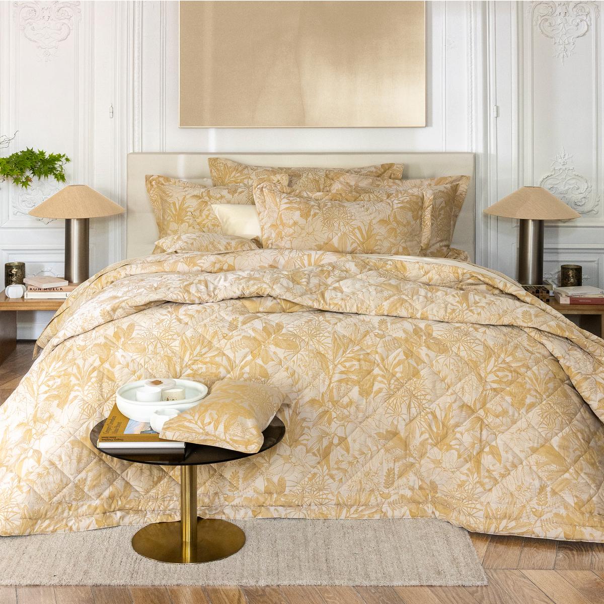 The quilted "Bois Dormant" bed throw and matching cushion covers by Le Jacquard Français perfectly complement the eponymous bed linen collection, bringing luxurious harmony to the bedroom. Crafted from the finest Egyptian cotton in a refined Jacquard weave, the fabric features an intricate leaf and bird design in ivory and golden tones.