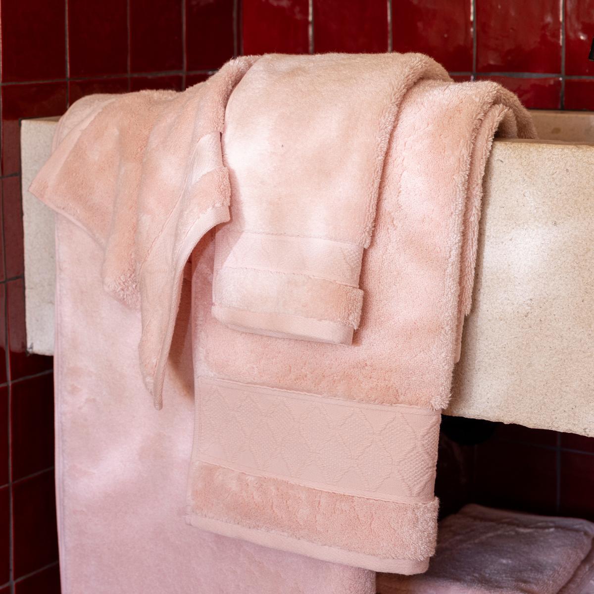 Enhance your bathroom with the "Caresse" terry towels by Le Jacquard Francais. The incredibly soft and gentle series "Caresse" by Le Jacquard Francais is inspired by the feminine, powdery pastel colours of cosmetics. The towels have a beautiful border in the shape of diamonds. Thanks to the high quality, the towels are very absorbent, hard-wearing and will retain their shape however much you use them.