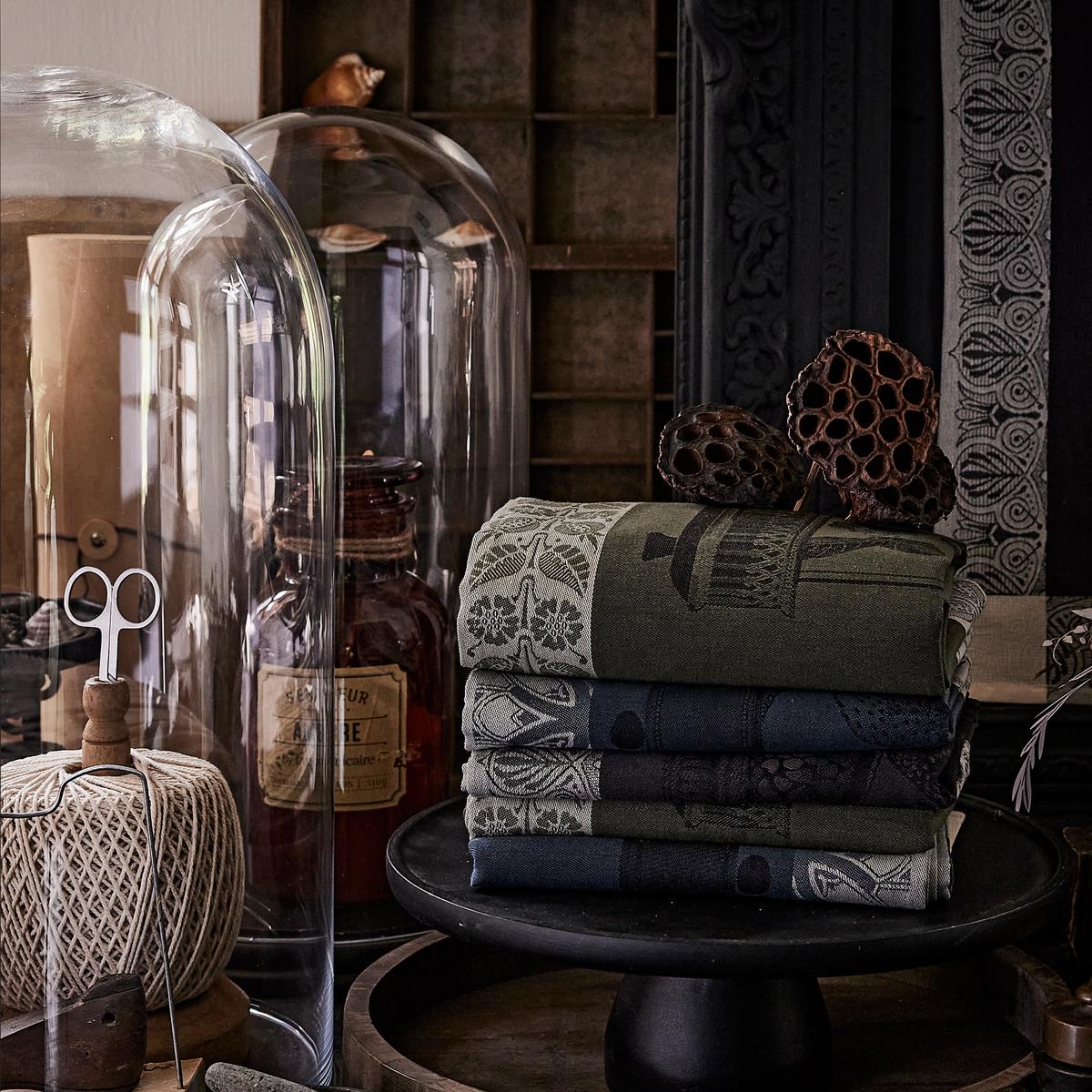 Celebrate nature with the "Curiosités" tea towels by Le Jacquard Francais. "Curiosités", a collection that comes to life like a veritable cabinet of curiosities, where decorative glass bells celebrate nature. This sublime damask tea towel, absorbent because it's made of pure cotton, and its dark colors will plunge you into a confidential and distinguished atmosphere in any season.