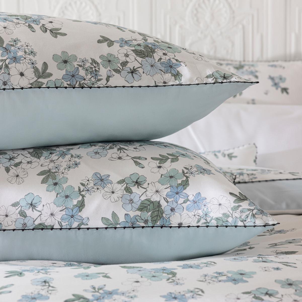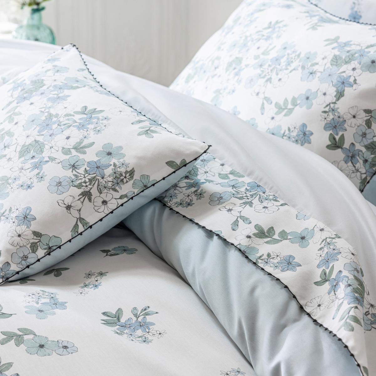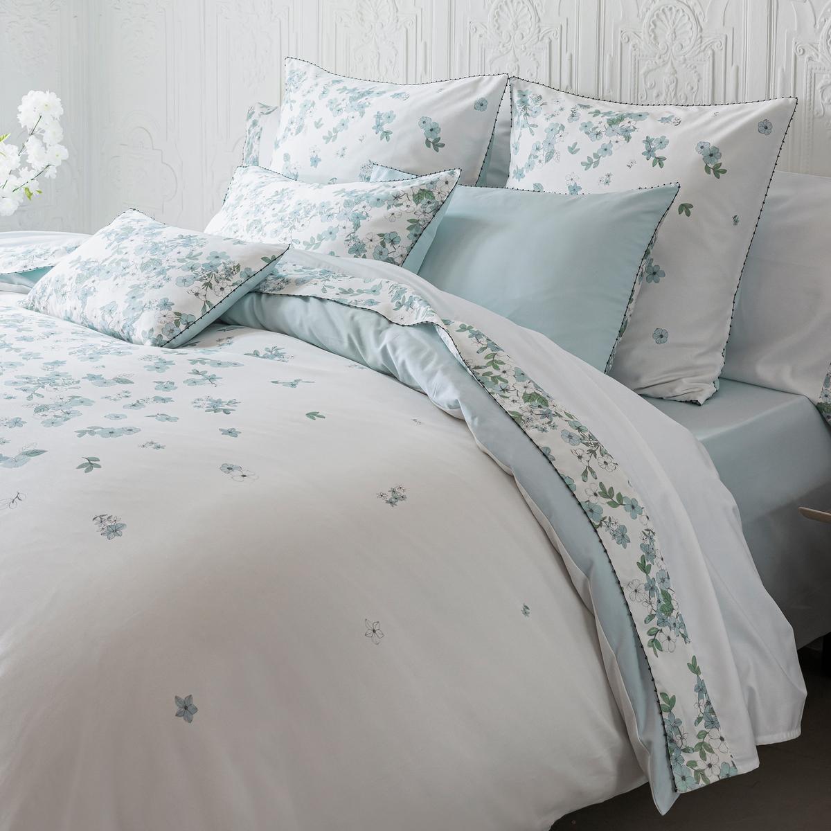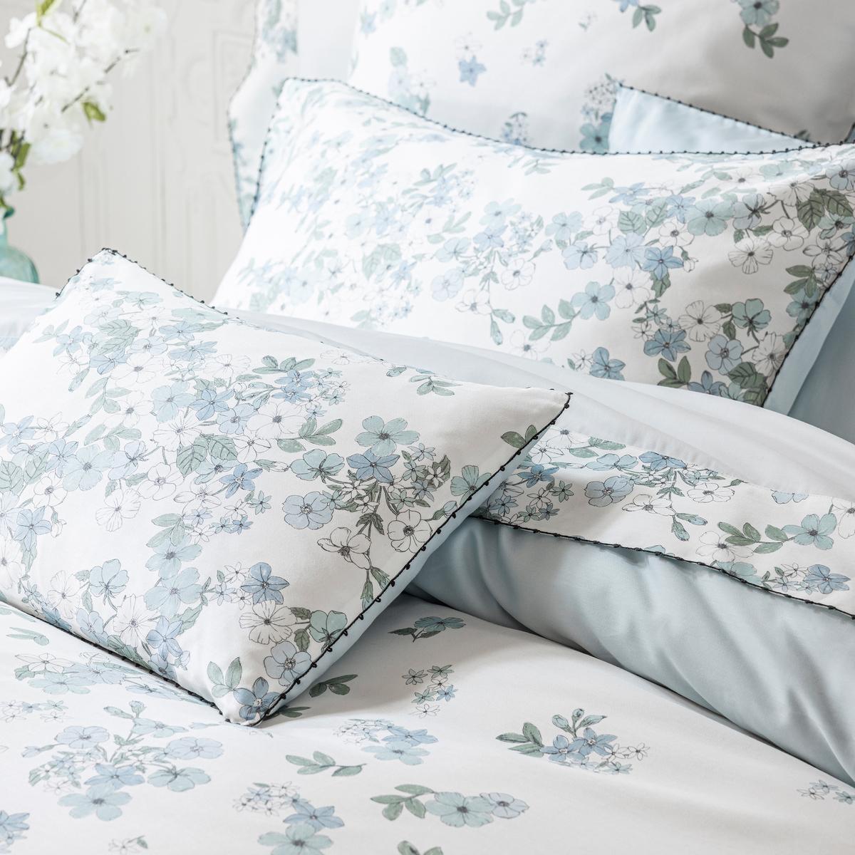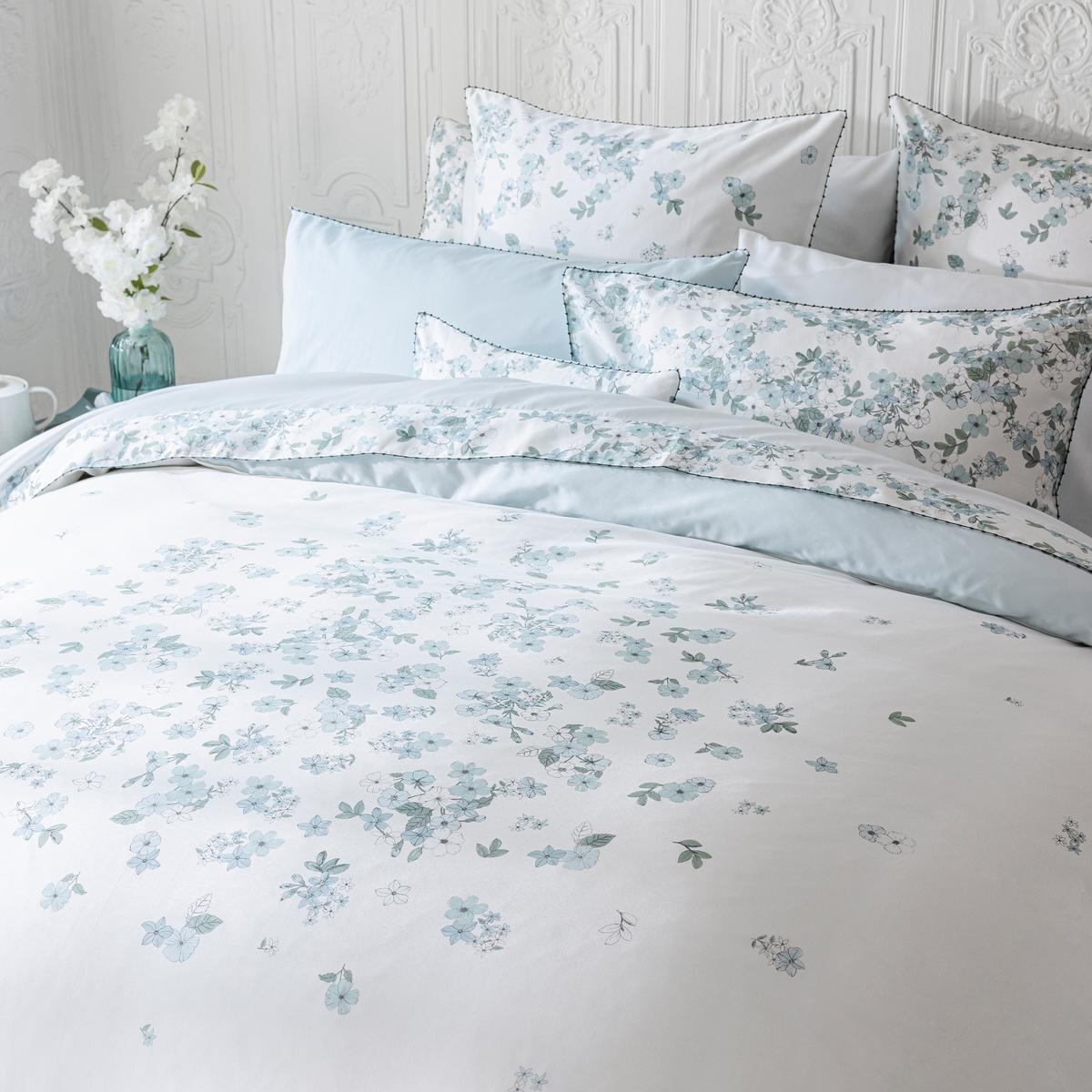 The "Manuka" bed linen from Le Jacquard Francais is adorned with manuka blossoms and Japanese quince trees. Shades of celadon, water green and sky blue, emphasised by a fine, delicate stroke, ensure natural elegance. The front of the cushion and duvet covers in white cotton satin features a carefully composed motif, while the single-colour reverse in soft celadon blue provides a calm balance.