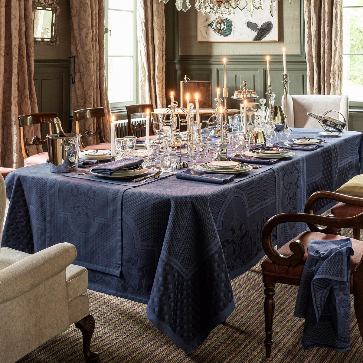 The "Palais Venitien" table linen in blue from Le Jacquard Francais is inspired by the marble floors of the iconic palaces of Venice. The baroque arabesques and geometric patterns are a sophisticated reminder of Italian sophistication.