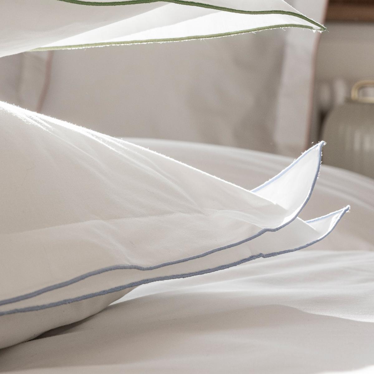 Modern and fresh: the "Songe" bed linen from Le Jacquard Francais with a double flange can be varied endlessly. A fine blue overlock refreshes this timeless bed linen made of percale cotton.