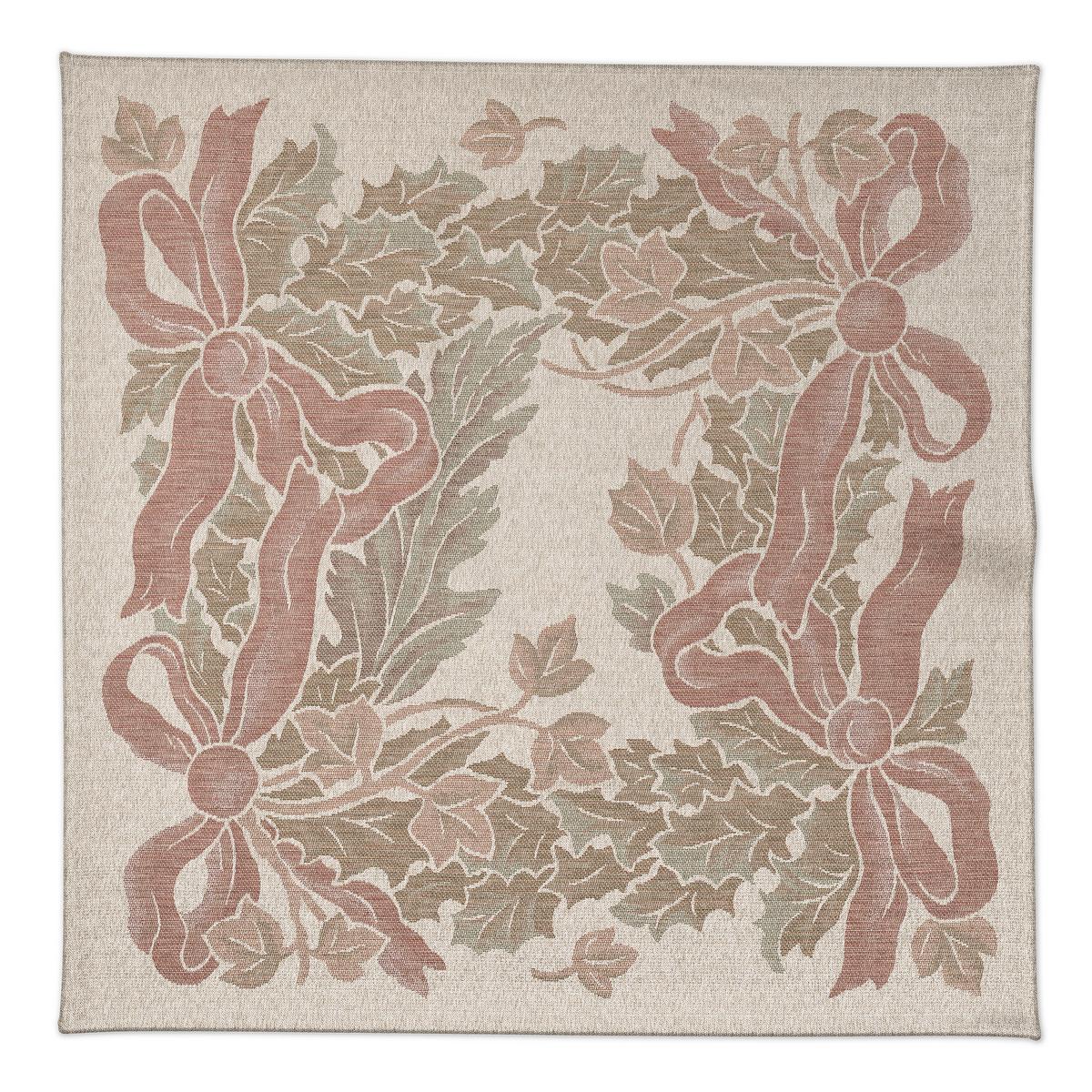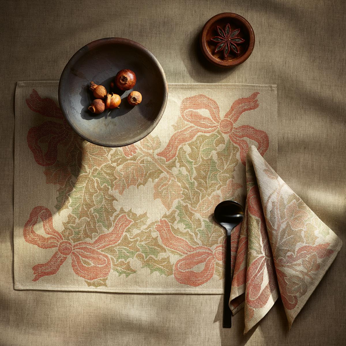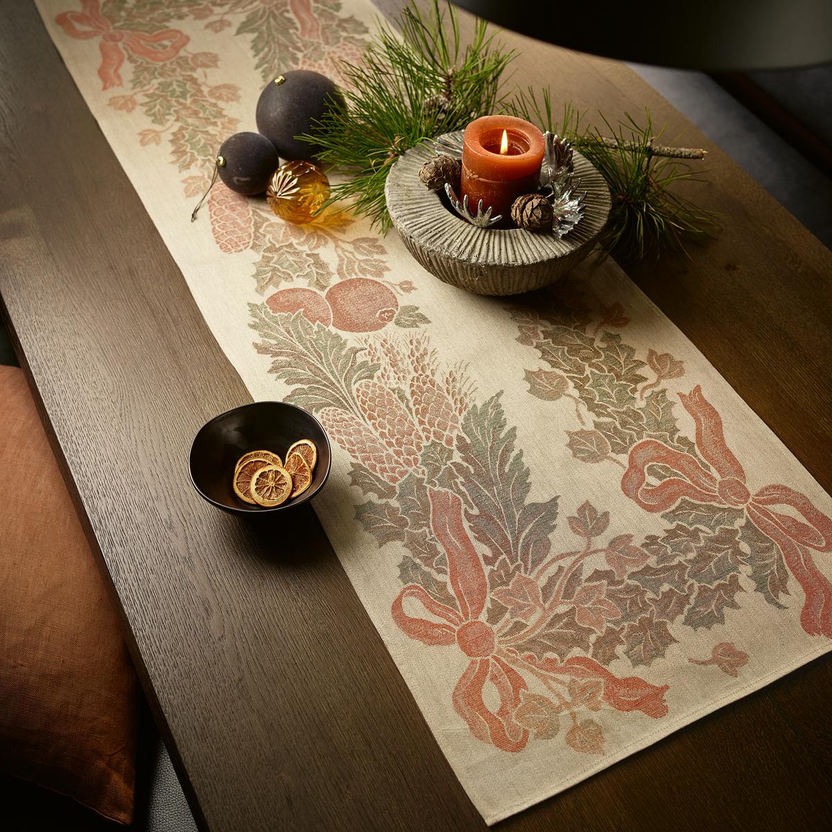 A dreamy Christmas table. The "Garland" table linen in the colourway "Autumn Leaves" by Leitner enchants the Christmas season with its festive magic. Made of pure linen, a timeless garland motif of playful bows and wintry branches shimmers in delicate vintage colours on the lustrous jacquard fabric.
