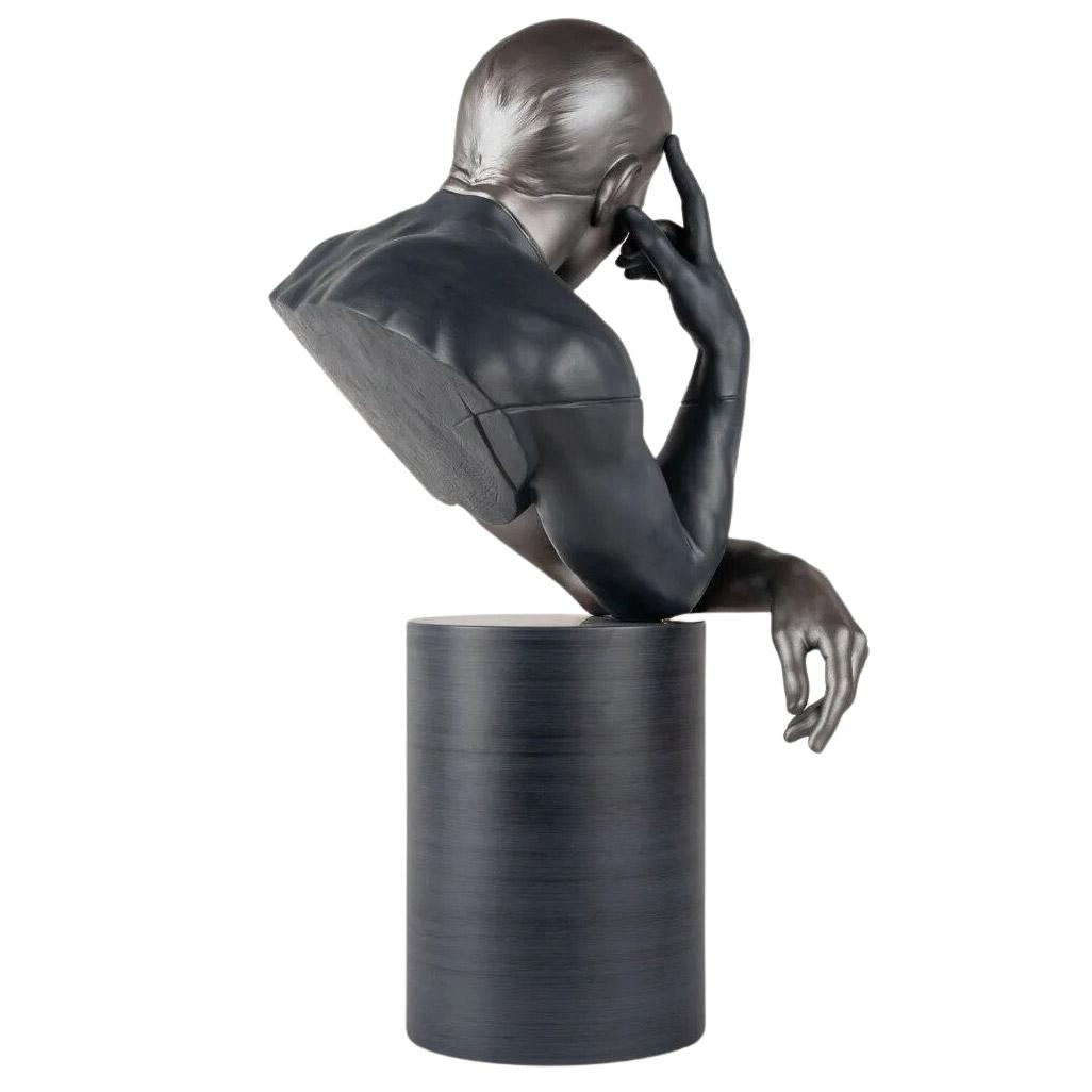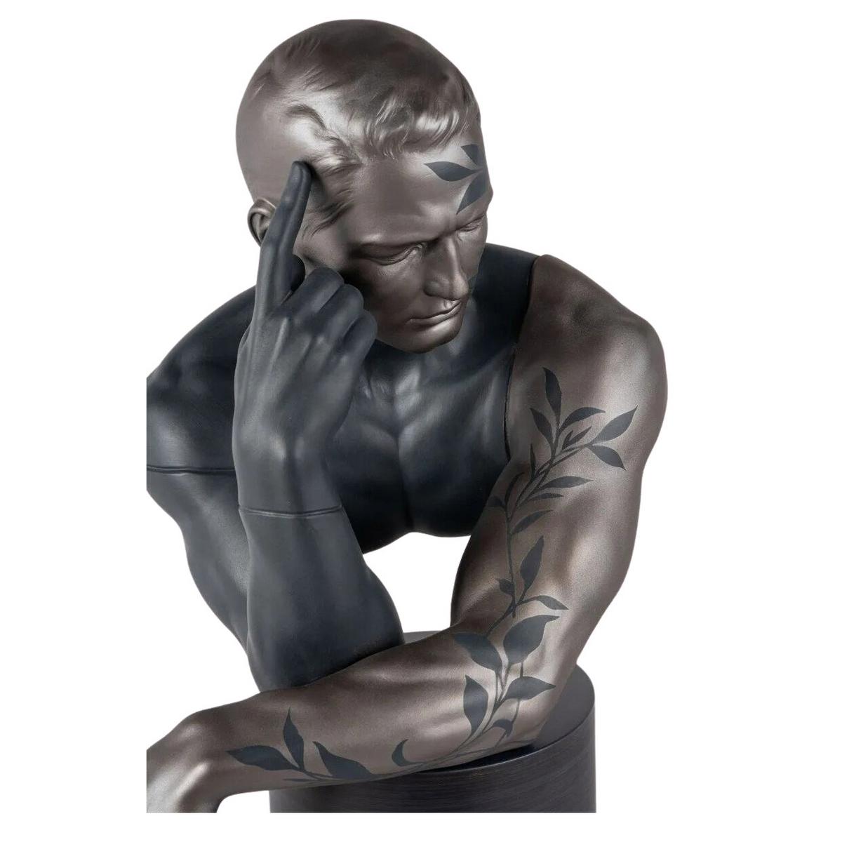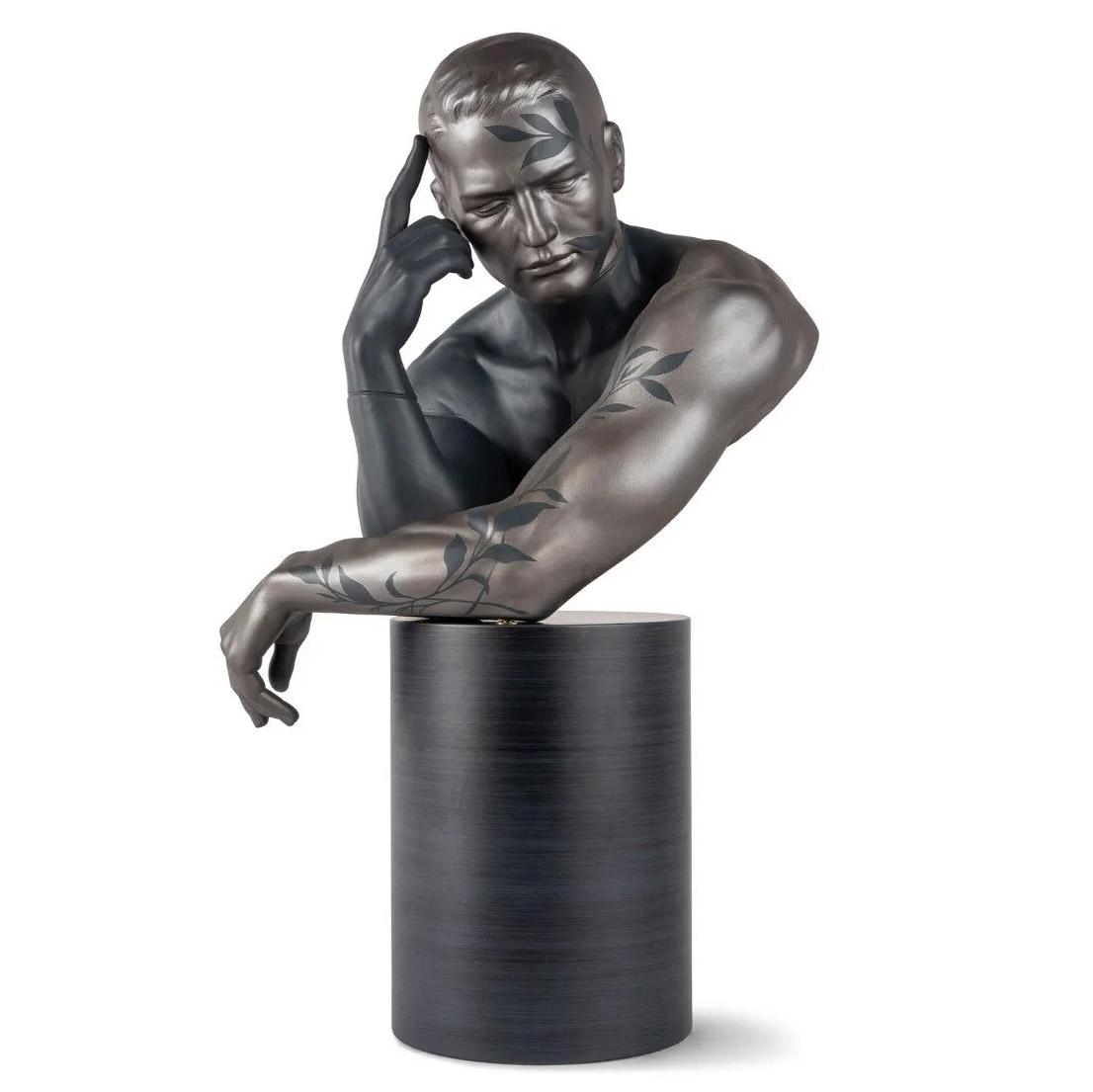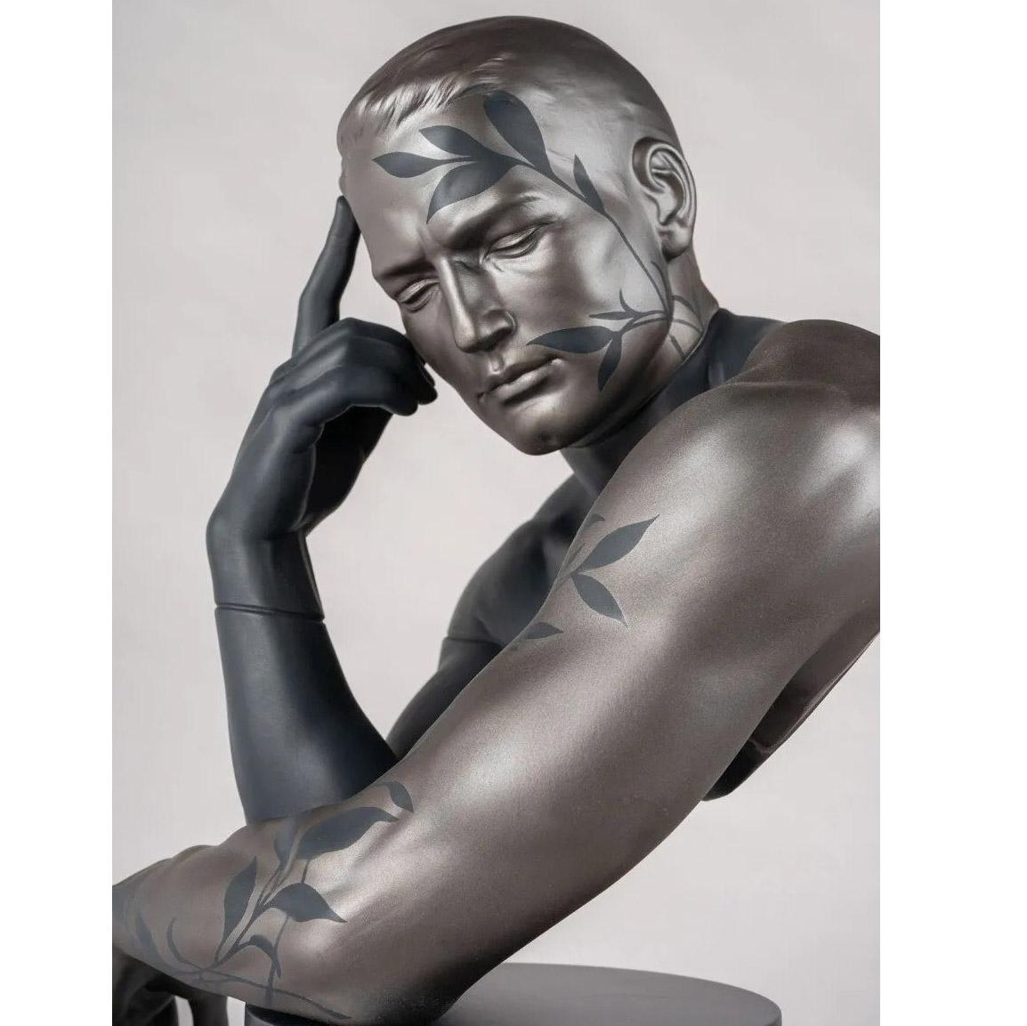 The "Reflections of Nature - Him" sculpture by Lladró portrays a man in a pensive inner-looking pose. It reminds us of the essential bond between man and nature, our responsibility for looking after it and the need to respect it.
