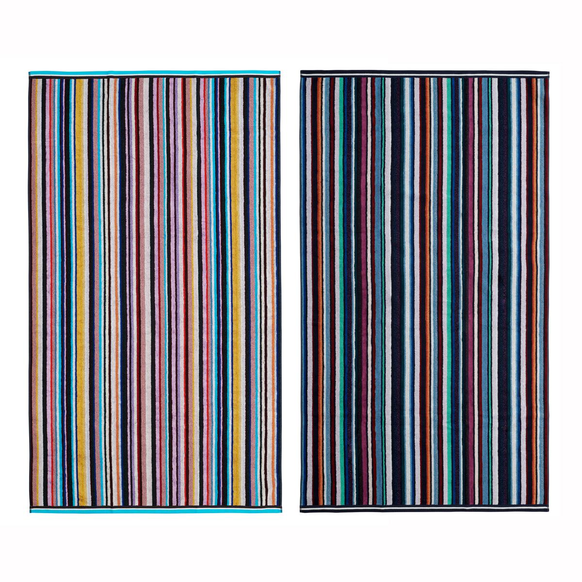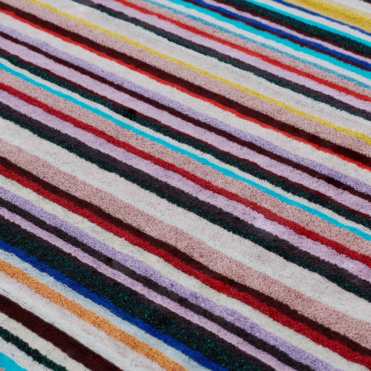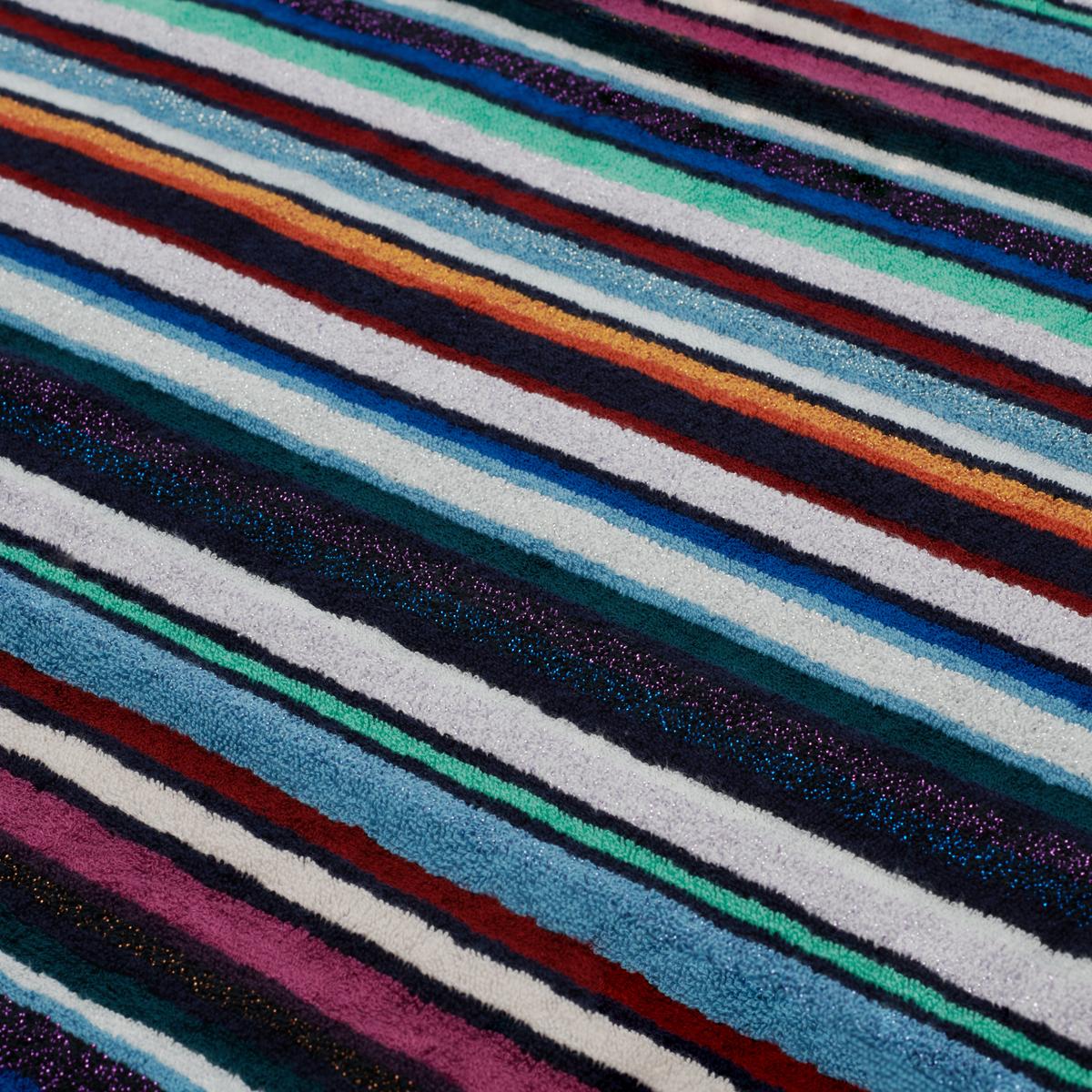 Add a hint of glamour to your next beach holiday with the striped "Chandler" beach towels by Missoni Home. Interwoven with shiny metallic Lurex threads, the beach towels' complex striped patterns stand apart with a discreet touch of sparkle. The beach towels are woven from cotton, viscose, and Lurex and have two sides, a velour and a terry side. The fluffy soft velour side is extra comfortable to lie on while the terry side dries the skin in seconds.