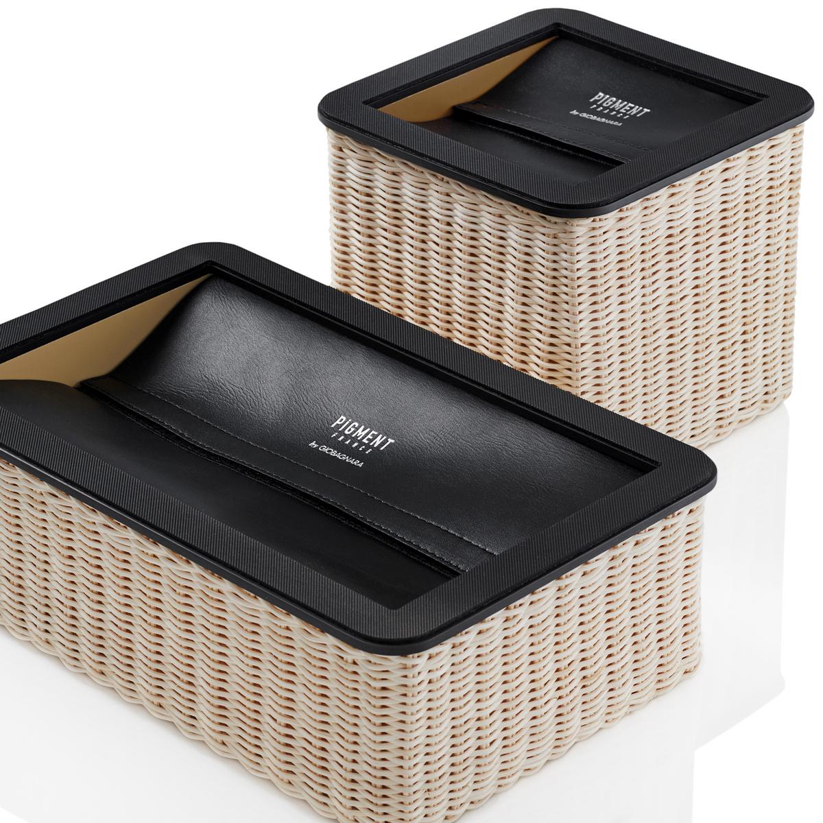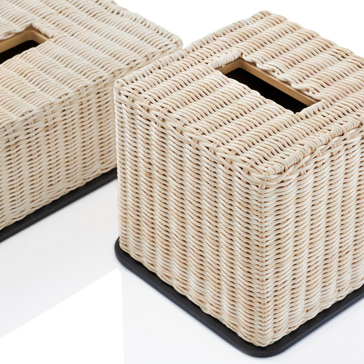 Natural highlights. The "Amiens" tissue box covers by Pigment transform standard tissue boxes into extraordinary decorative objects. The sleeves are made of hand-woven, fine rattan over a sturdy wooden construction. A heavy, bronze-coloured brass frame ensures a secure stand, while a soft base with Velcro fastening keeps the tissue boxes in place. With their simple and elegant weave pattern, the covers are charming and modern furnishing objects in a sophisticated natural style.