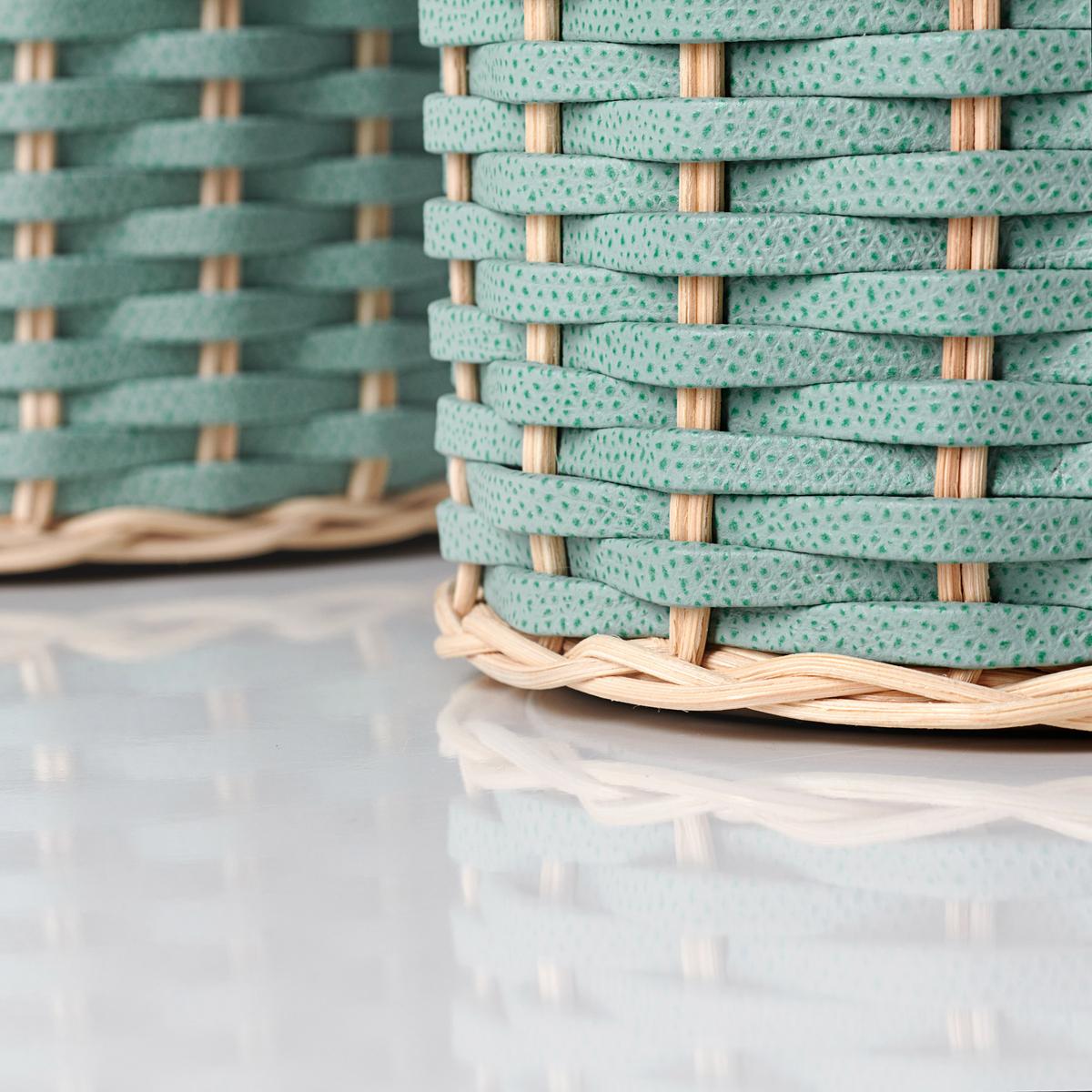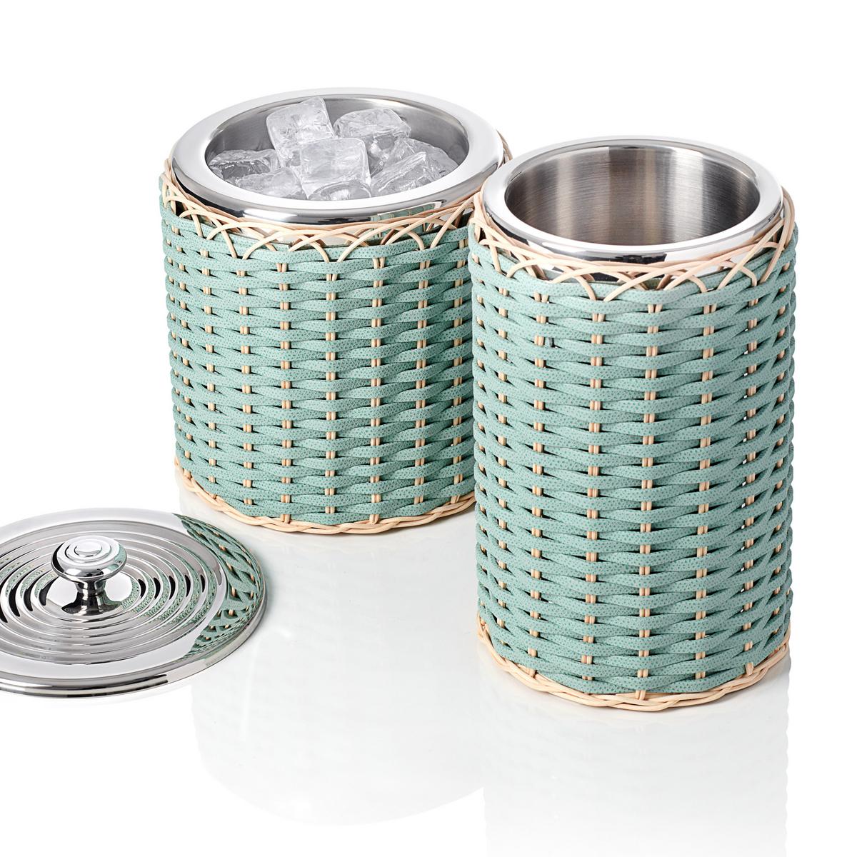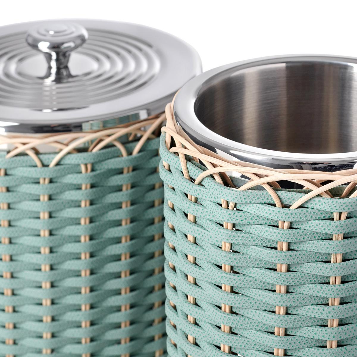 A refreshing duo. Enjoy cool drinks on warm days with the "Menton" wine cooler and ice bucket by Pigment. The experienced craftsmen at the manufactory hand-braid the double-walled containers made of chrome-plated brass with natural rattan and hand-dyed strips of calfskin in mint green. The simple, elegant weave pattern and modern colours elevate the simple containers to charming and modern home accessories for a distinguished lifestyle.