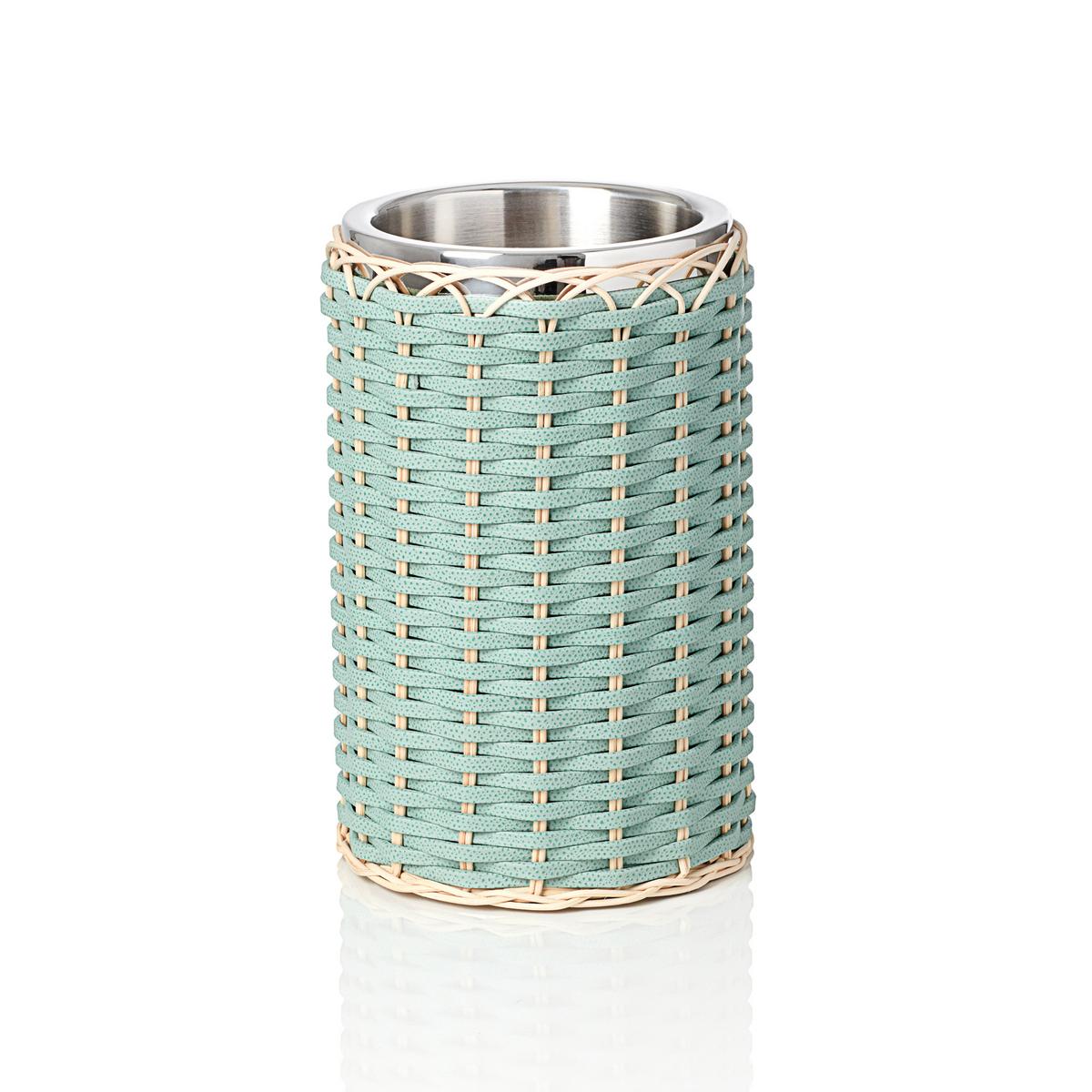 A refreshing duo. Enjoy cool drinks on warm days with the "Menton" wine cooler and ice bucket by Pigment. The experienced craftsmen at the manufactory hand-braid the double-walled containers made of chrome-plated brass with natural rattan and hand-dyed strips of calfskin in mint green. The simple, elegant weave pattern and modern colours elevate the simple containers to charming and modern home accessories for a distinguished lifestyle.