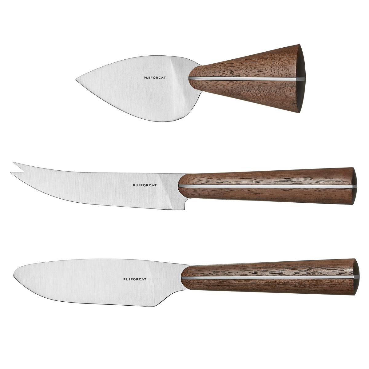 The collection includes three essential knives for every cheese-aficionado. Each knife is perfectly matched to one of the basic types of cheese: an almond-shaped knife for dry cheese such as Parmesan, a curved knife with a serving tip for semi-firm cheese and a knife with a supple, wide blade for soft and creamy cheese.