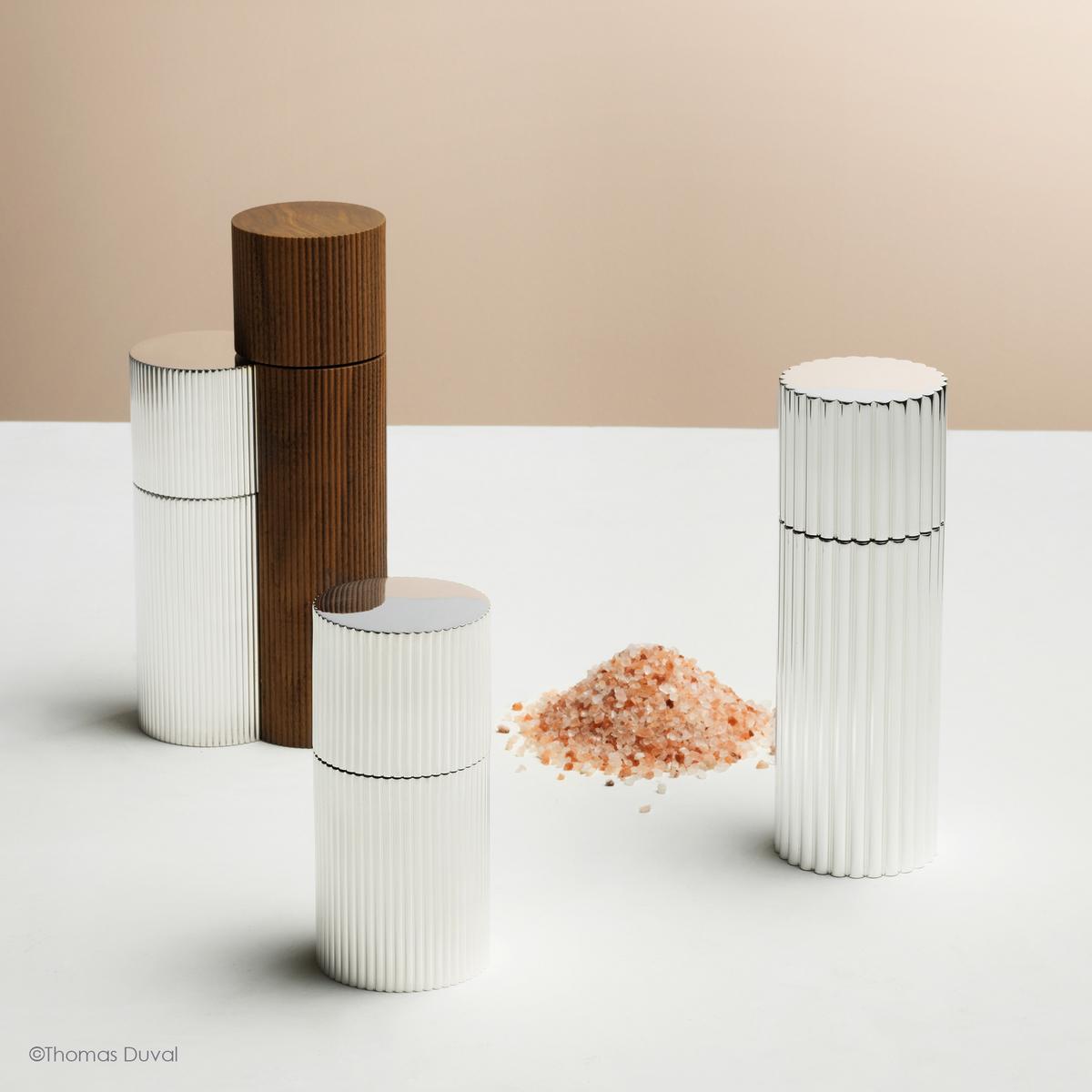 Jewels for the kitchen and the table. The "Granville" mills by Puiforcat are designed to be used and seen. The simple, architectural design by Grégoire de Lafforest is a perfect continuation of Puiforcat's identity. Made of silver-plated brass and American walnut wood, the large mills are enriched with the elegance of antique columns by fluted surfaces. The varying fineness of the fluting makes the mills easy to distinguish from one another at a glance. The CrushGrind ceramic mechanisms are adjustable for use with any spice. Use the "Granville" mills both in the kitchen and at the table – a bridge between preparing and tasting.