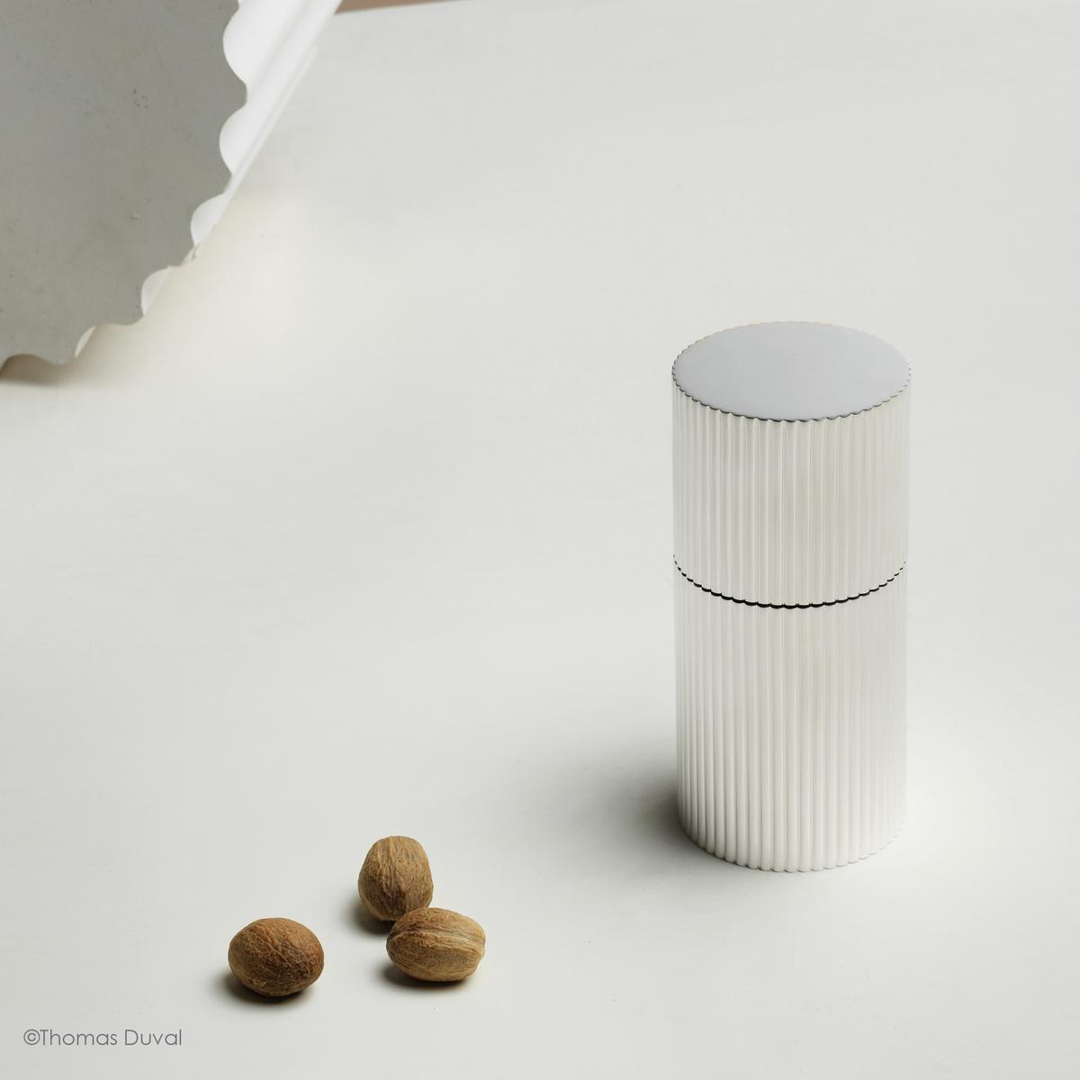 The "Granville" collection includes a salt and pepper mill set in two different designs, a spice box, a spice mill and a nutmeg mill. The asymmetrical design of the salt and pepper mills is a visual highlight and is only possible thanks to a custom mechanism. The nutmeg mill is equipped with a special Peugeot mechanism that can be filled with a whole nutmeg from the bottom.