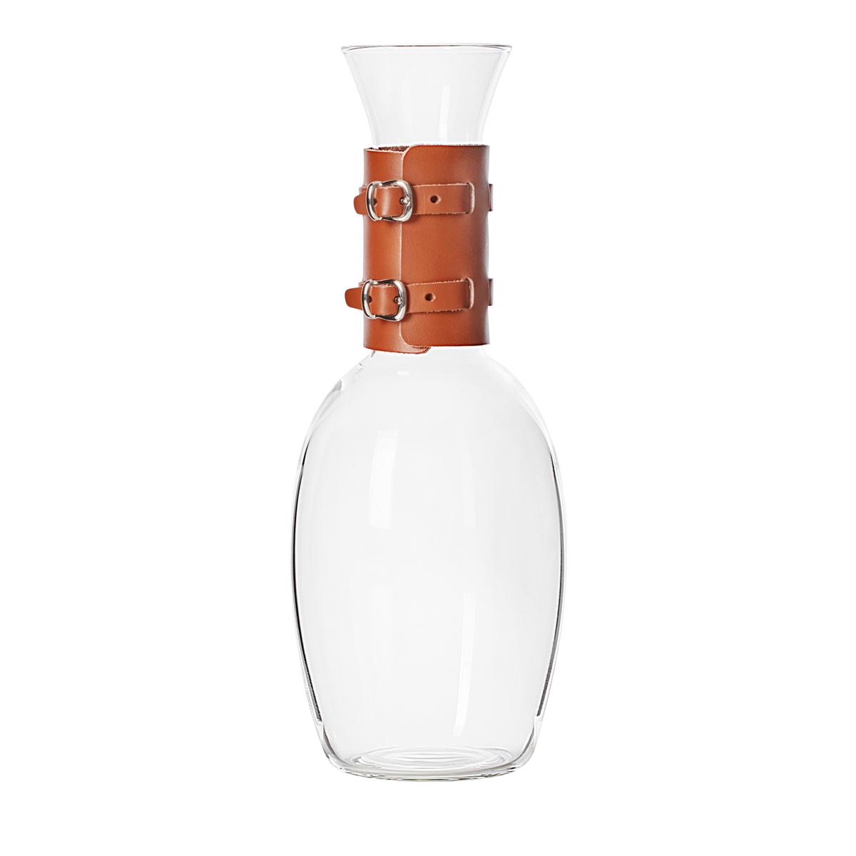 The "Echo" jugs by Rabitti 1969 combine timeless glass aesthetics with refined leather craftsmanship. Made from borosilicate glass, they impress with a clear, reduced design language. A partial covering of fine saddle leather, accented with decorative buckles, creates a striking contrast while providing a distinctive tactile quality and a secure grip.
