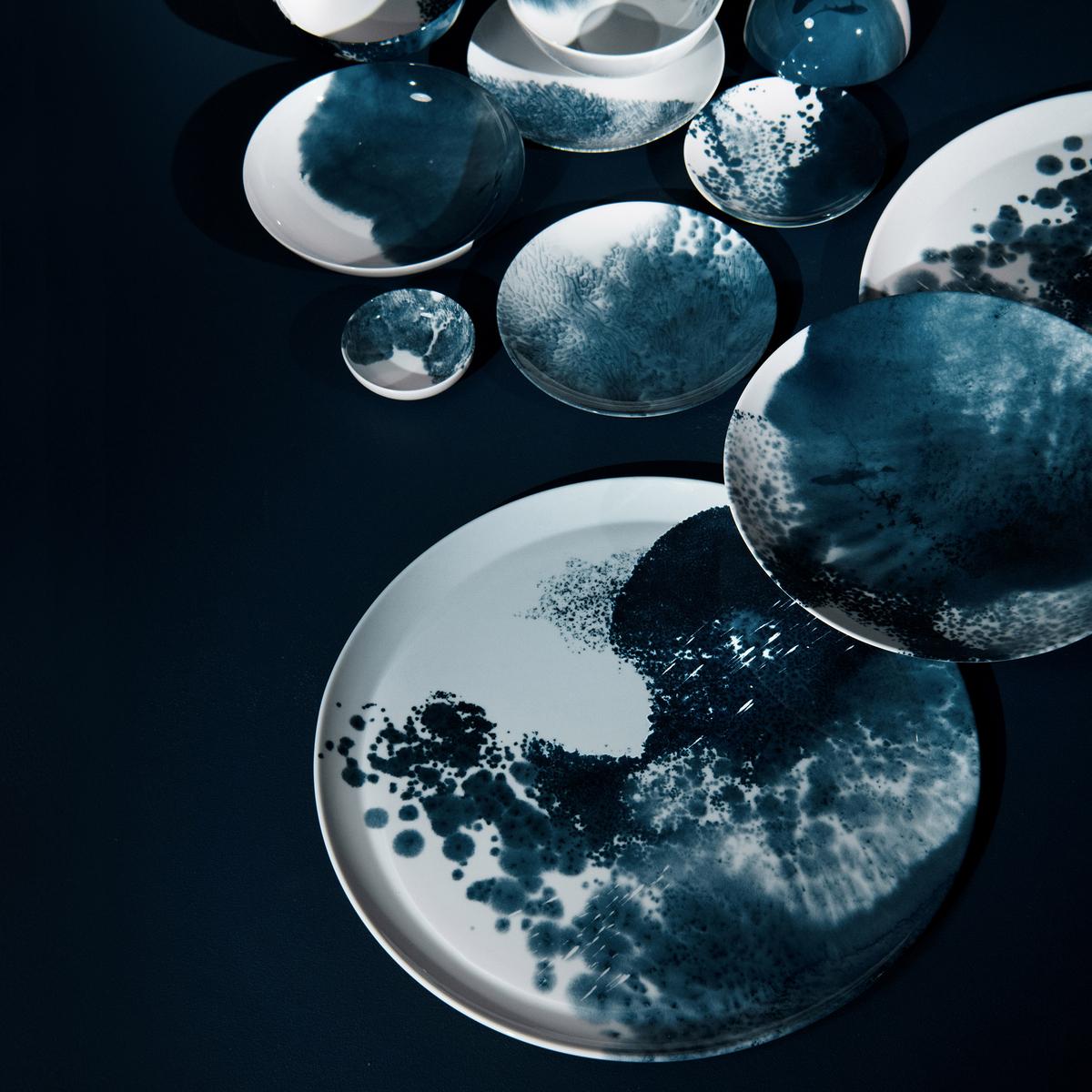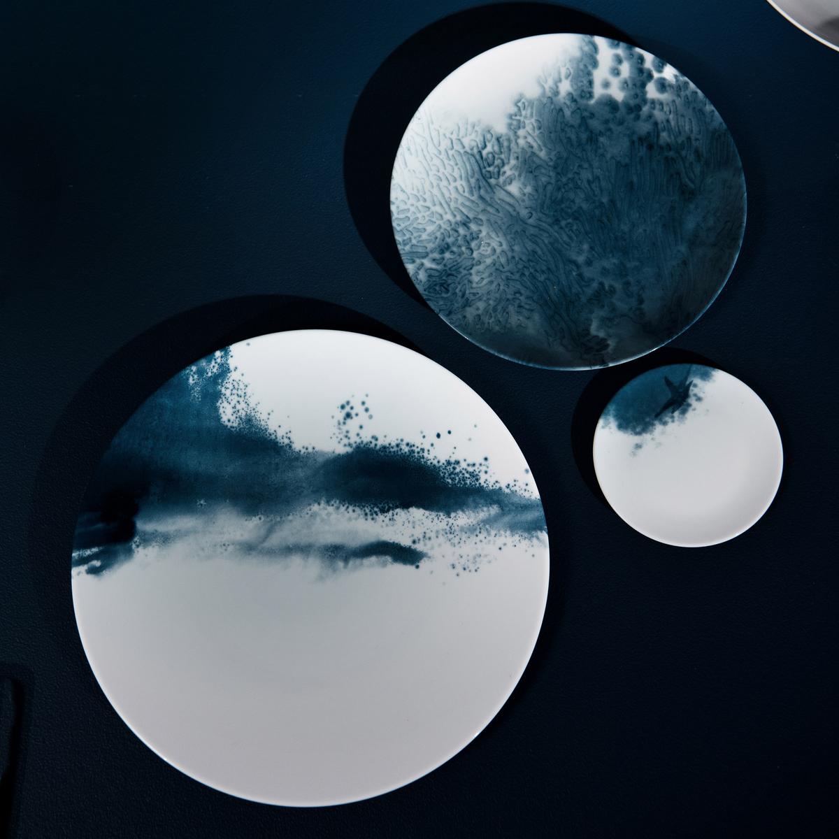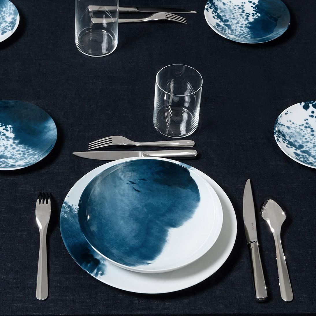 Explore the deepest abysses of the sea with the "Abysses" dinner service by Raynaud. Indigo blue decorations made up of dynamic brushstrokes transform the pure white Limoges porcelain into unfathomable underwater worlds. Sometimes dynamic and dark like raging currents, sometimes soft and light like misty coastal landscapes, the designs that extend to both sides of the dinnerware pieces allow endless maritime associations.
