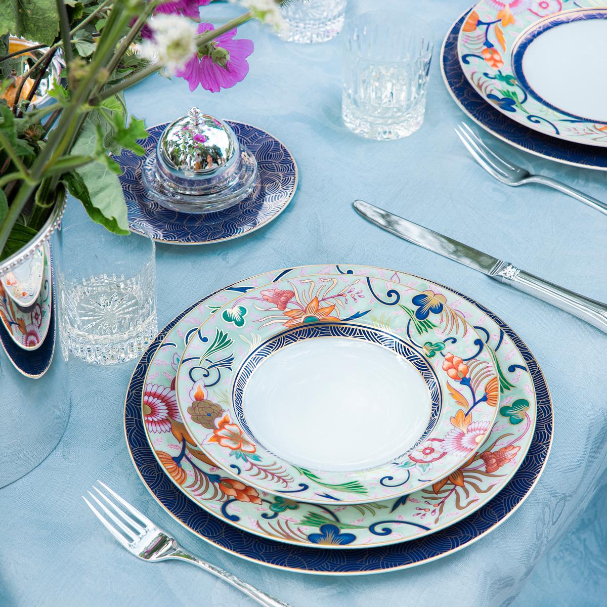 Designer Olivier Maillefer created the "Imari" decorations as watercolour paintings. Free from rigid structures and strict symmetries, he created new floral motifs of graceful elegance and cheerful spontaneity for each piece in the extensive collection. Generous fine gold applications bring the 17 different colours of the floral designs to life. Deep blue plates covered in golden patterns form a fantastic contrast to the colourful floral splendour.