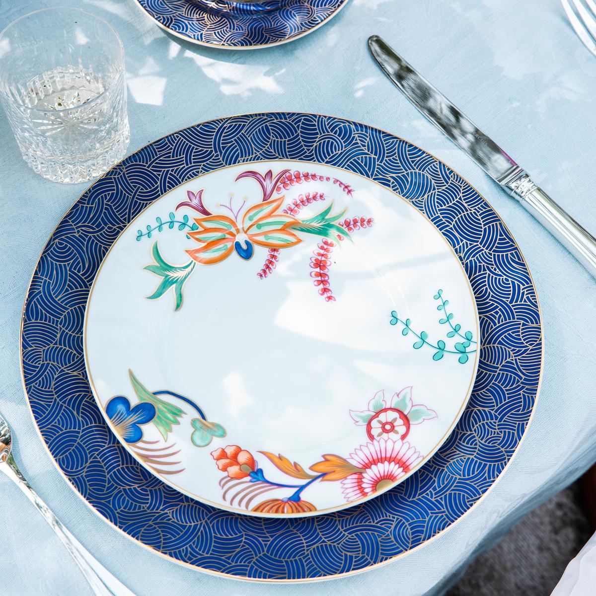 French Limoges porcelain with Japanese flair. The "Imari" dinner service by Raynaud is a love letter to Imari porcelain from the Japanese island of Kyushu, the southernmost of the island state's four main islands. With its heavenly floral and geometric motifs in cobalt blue, rust red and gold, Imari porcelain has had a significant influence on European tableware since the 17th century. Raynaud reinterprets the historical style from the Far East and brings it back to the modern table with a contemporary lightness.