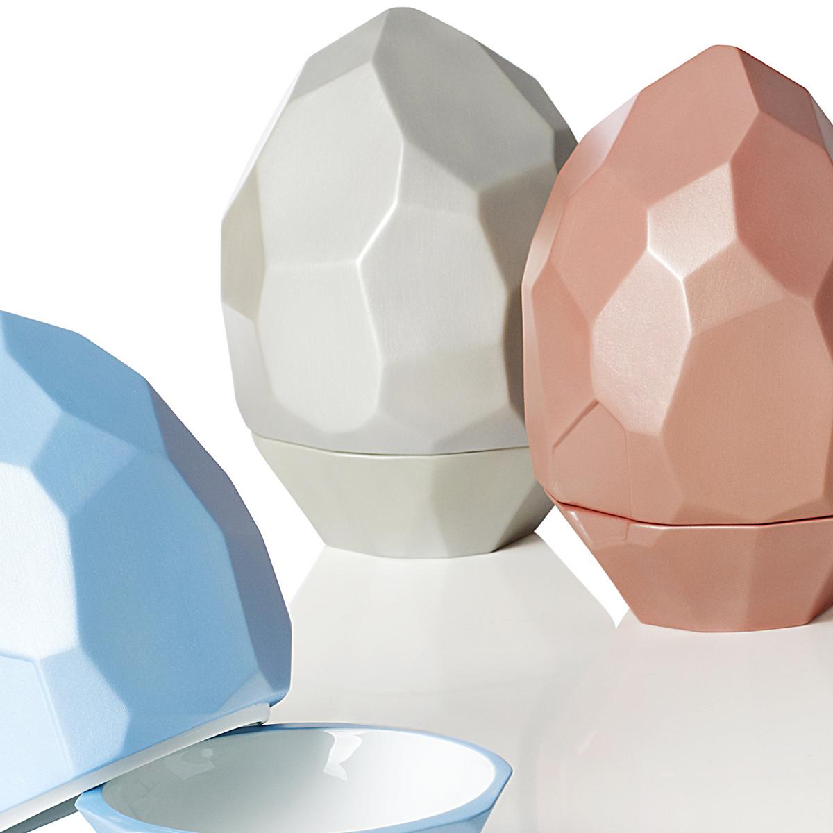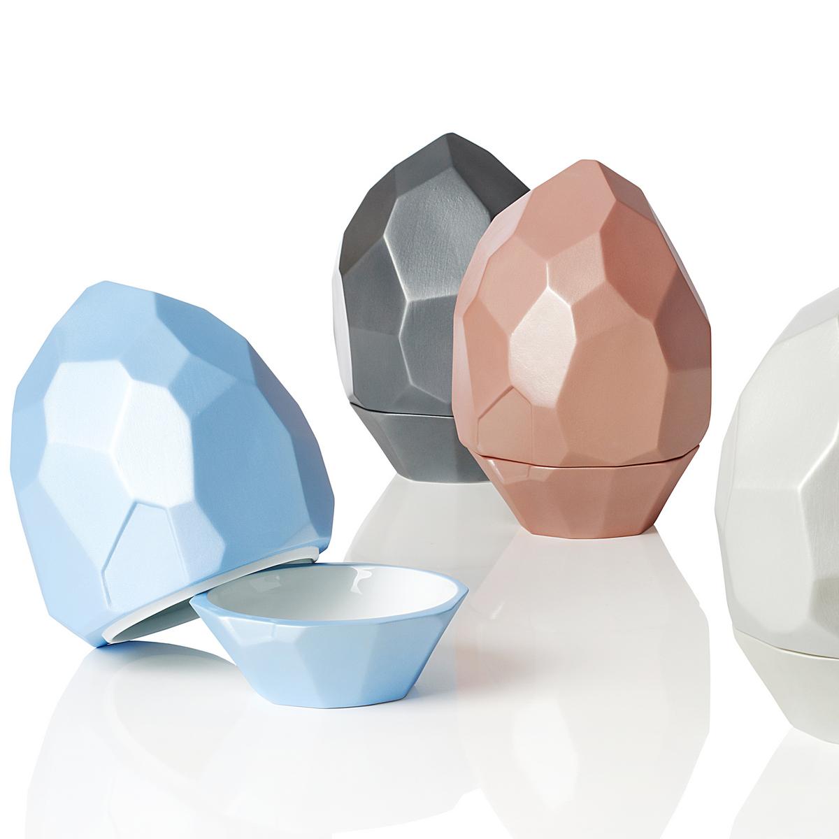 The special thing about the "Pépites Irisées" rocks are the unique shimmering colours, which are created through a very elaborate manufacturing process. When light falls on the coloured sections, the textured surface and the use of metallic pigments create a particularly beautiful play of matte and shiny sections. The "Pépites Irisées" rocks are handcrafted from the finest Limoges porcelain at the French Raynaud manufactory.