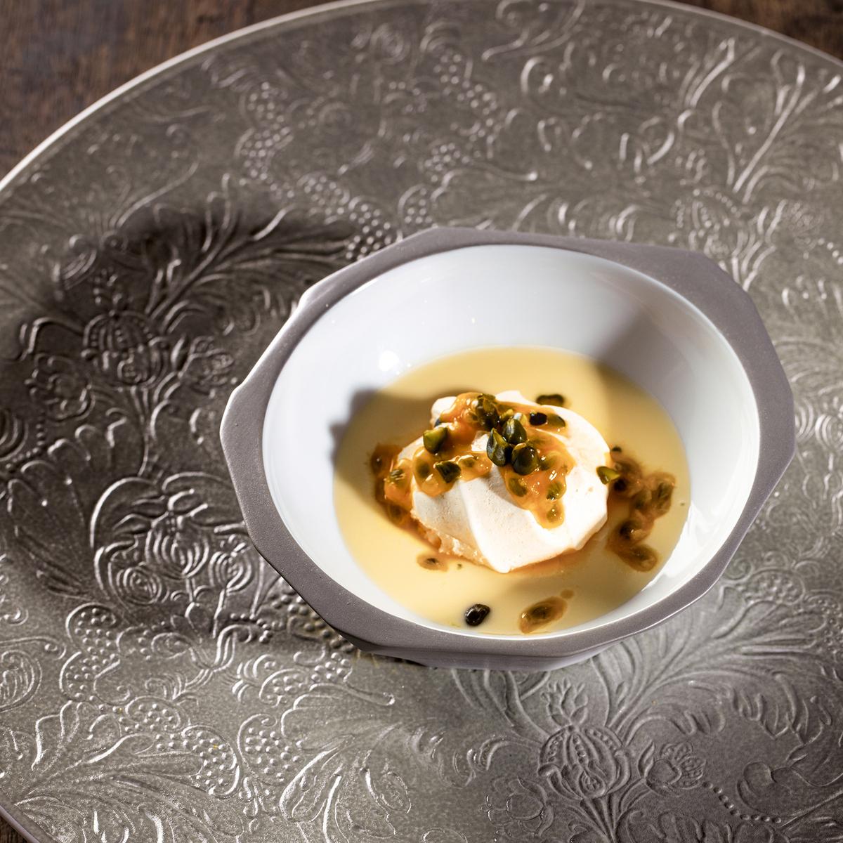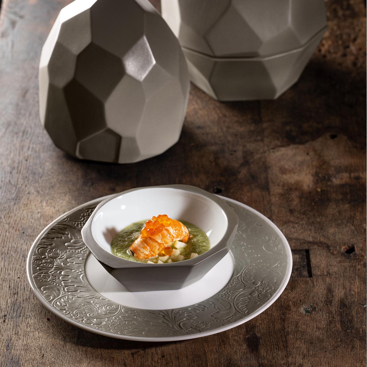 The "Pépites Irisées" rocks by Raynaud open up countless possibilities for serving fine food. The lower plate has a diameter of about 15 cm and a good depth for serving soups, for example. Starters or desserts can also be beautifully presented in the rocks.