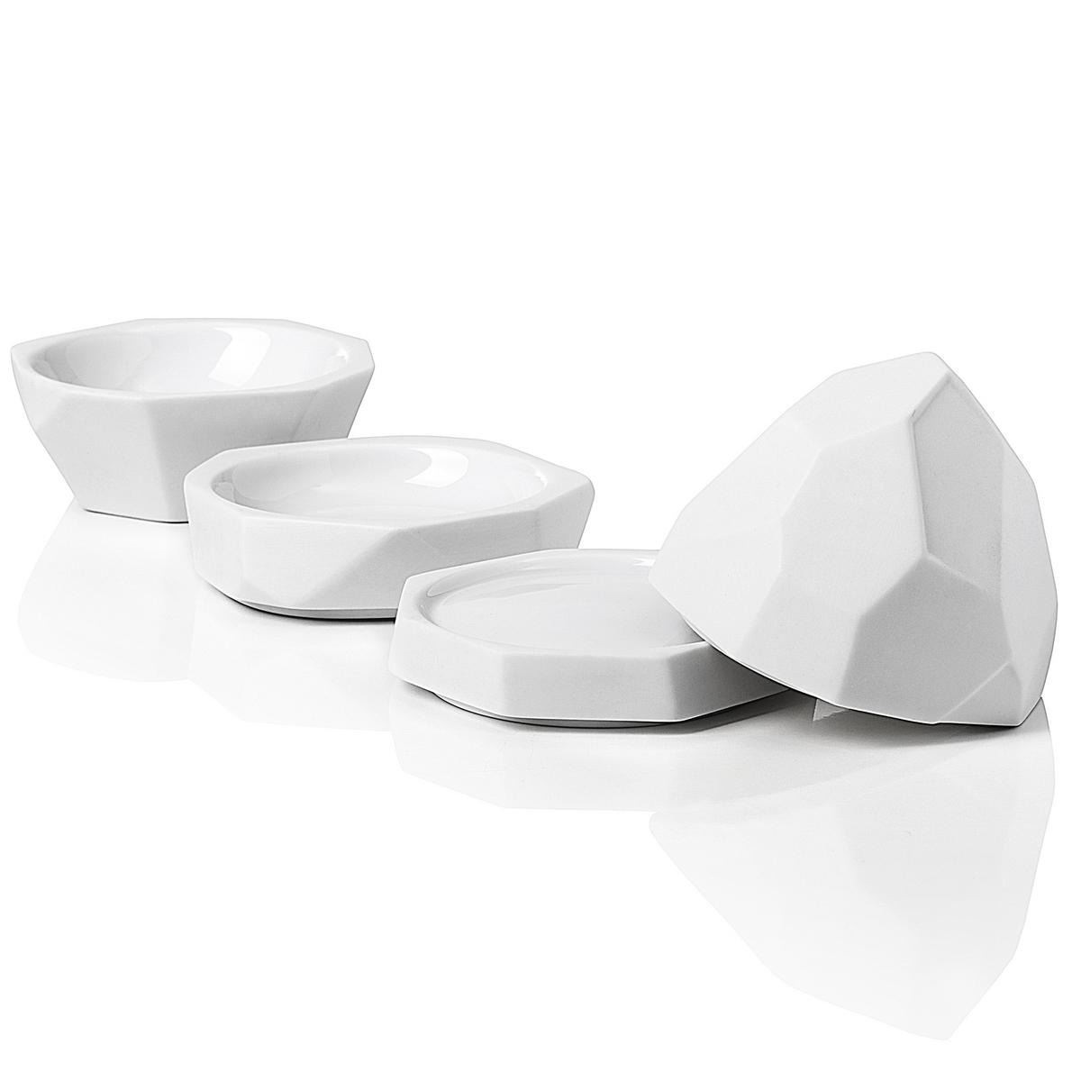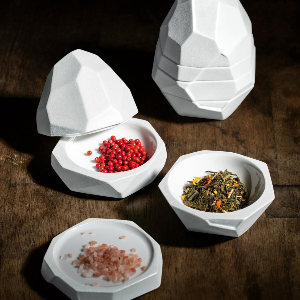 Rock the table: The white porcelain "Pépites" table boulders by Raynaud are stackable bowls and plates with innovative shapes. The "rock" pieces are glazed on the inside and velvety matt on the outside.