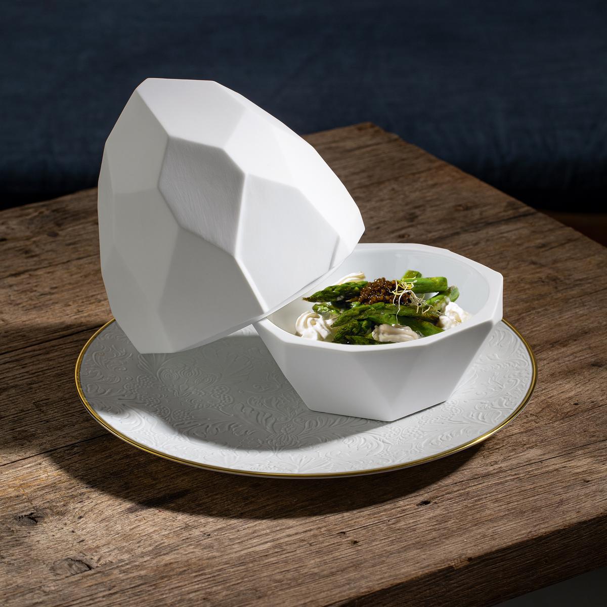 The "Pépites" rocks by Raynaud open up countless possibilities for serving fine food. The smaller rocks with a height of 9 cm or 14.5 cm are particularly suitable for spices, oils, tapas or a small "amuse gueules". The larger rocks with a height of 22 or 24 cm are suitable for starters, desserts or soups because of their deep plate. The upper part of the rocks serves as a cloche.