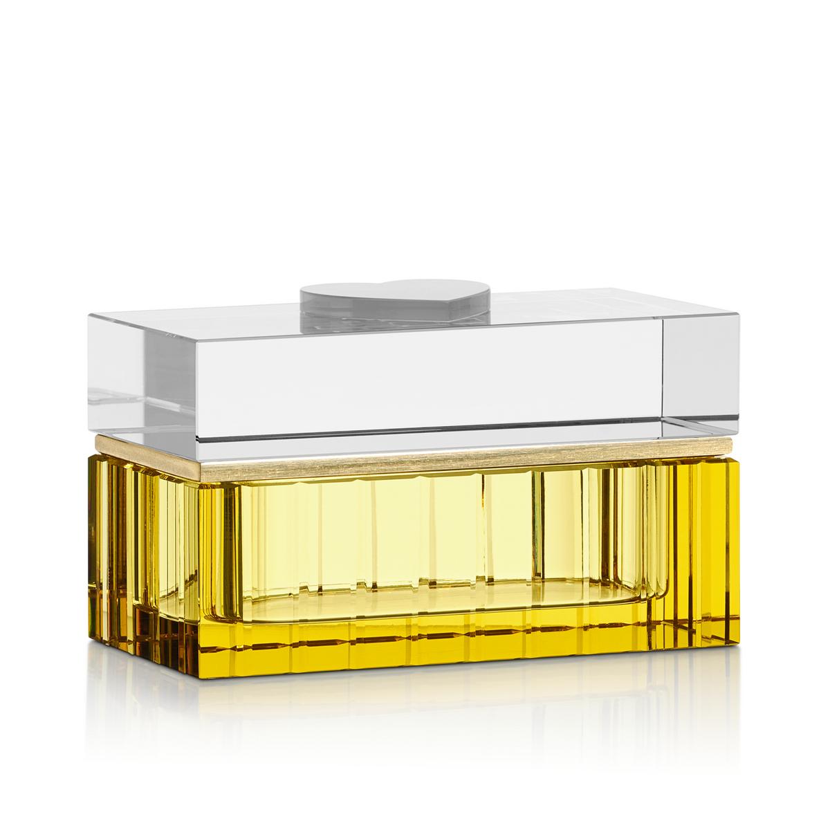 Each box is crafted from solid crystal glass using traditional craftsmanship. A delicate brass rim at the top of the box – visible just beneath the lid – lends the design a subtle, refined warmth and emphasizes the luxurious character of the pieces. On the lids, striking glass ornaments – the green eye, the blue moon, and the white heart – add distinctive accents, turning the boxes into sculptural statements.